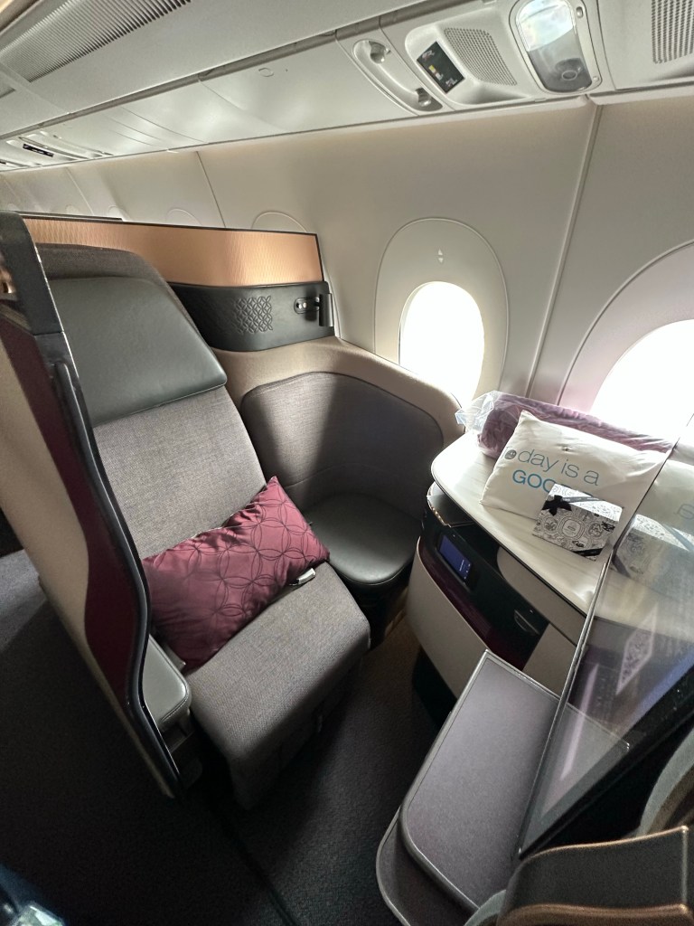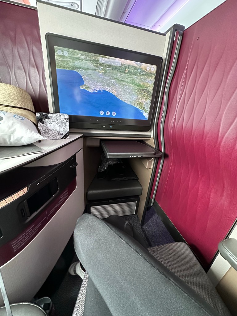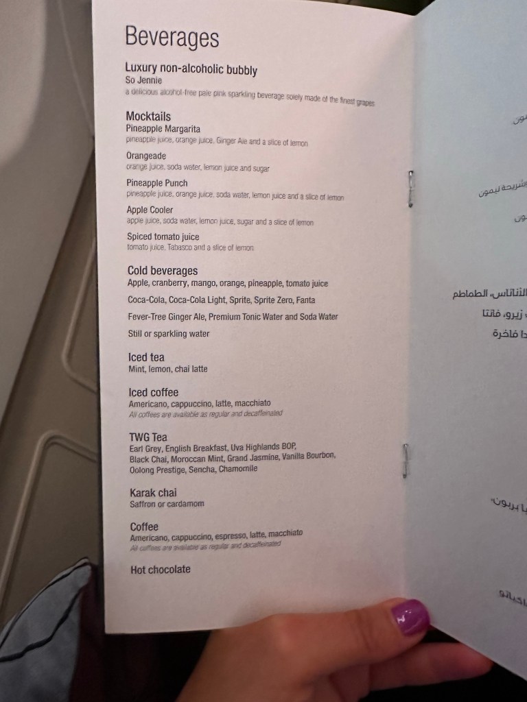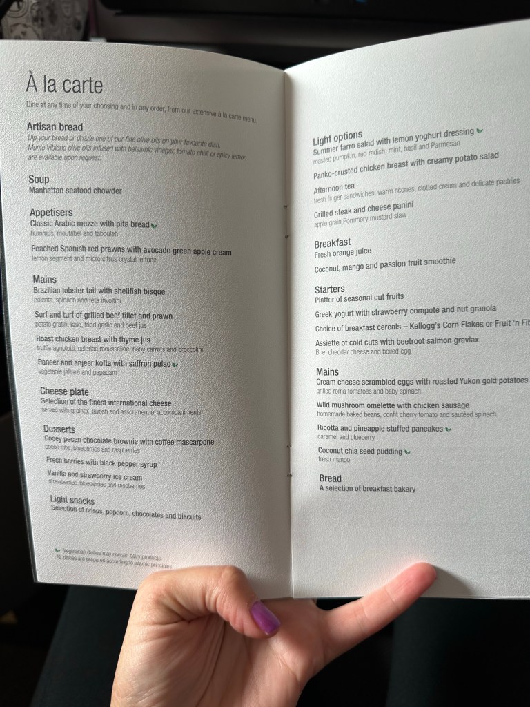 I have been anticipating this flight, my first time flying Qatar Airways and my first time in a QSuite. I was impressed the moment I sat down; with the spacious layout, storage, amenities, and the signature lime mint juice I selected as my welcome beverage. The lime mint juice lived up to all the hype I’ve heard about it and I can’t wait to try to recreate it at home; though I can tell it was heavy on the sugar. Reading the menu made me even more excited; lobster! Lobster tail on an airplane!