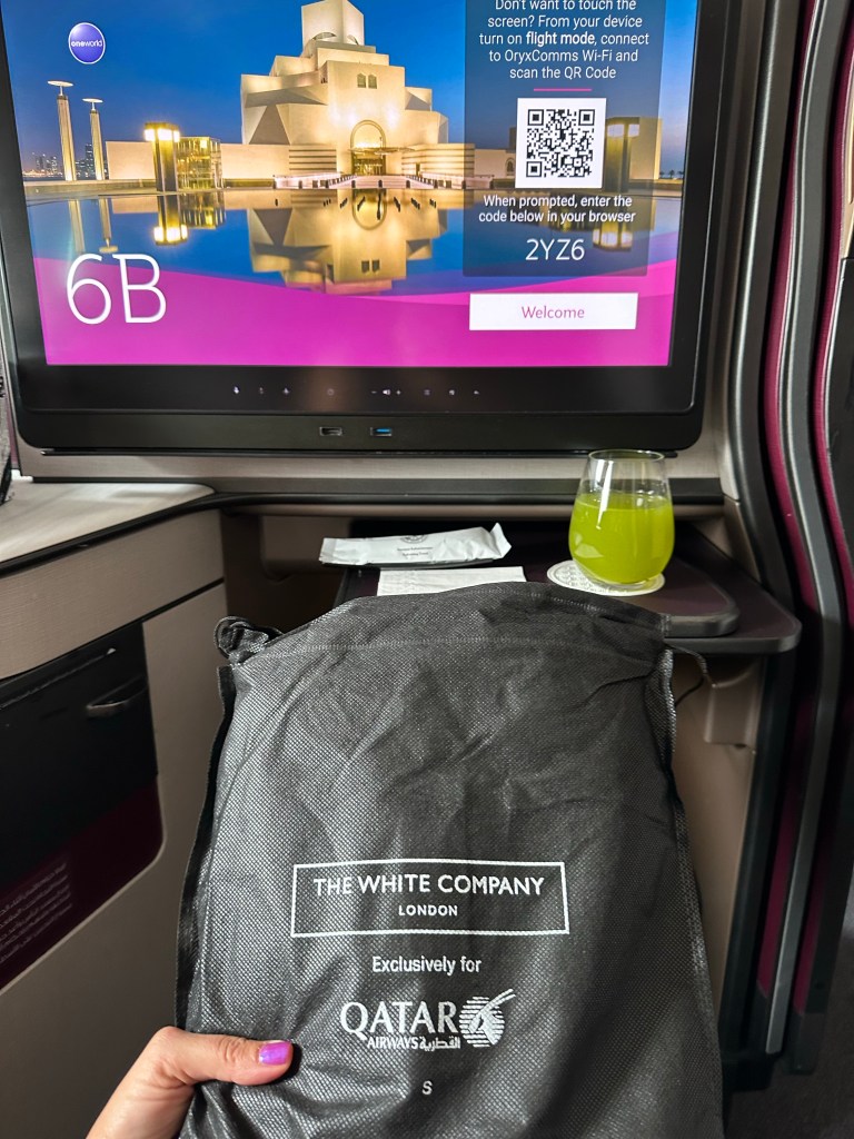 Another flight attendant came by to confirm my pajama size and present me with my White Company pajamas and slippers. As soon as the plane hit 10,000’ and I could close my suite door I changed into the pajama pants right there in my QSuite and settled in.