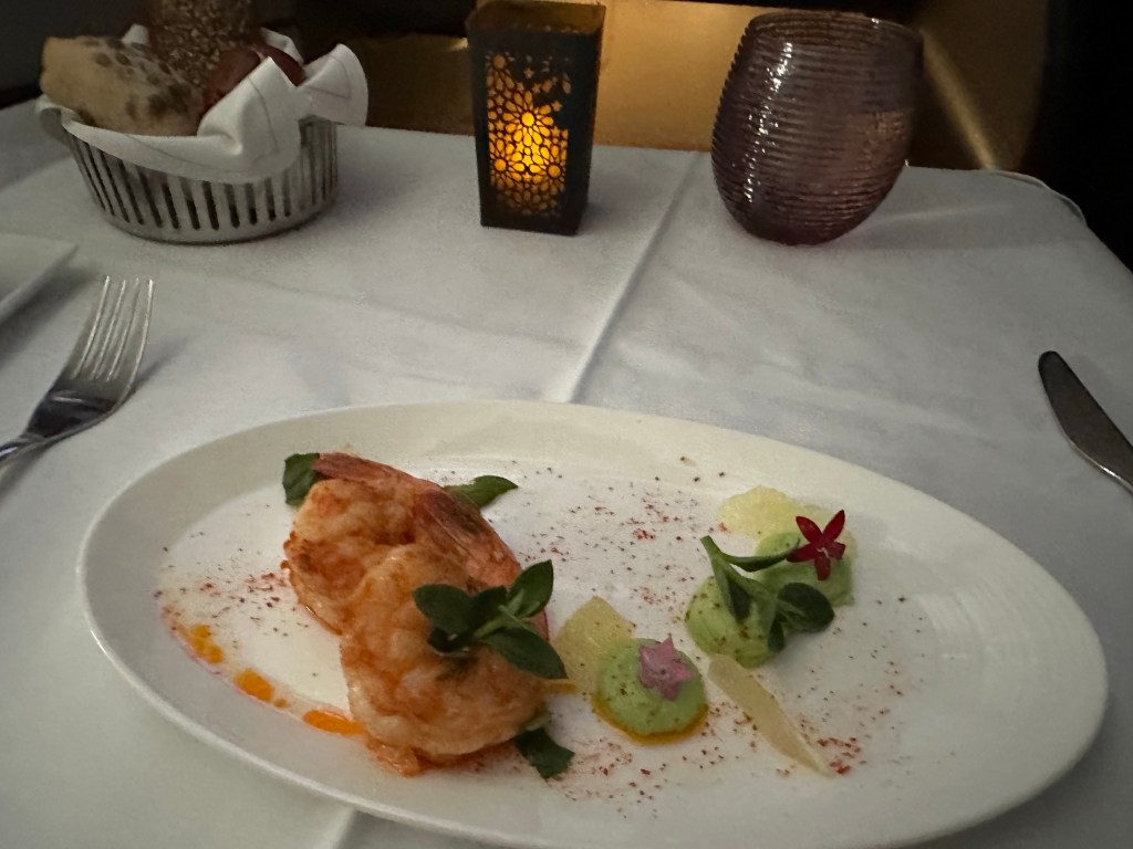 He set my table with a white linen cloth and glowing lamp for ambience before bringing me a smoked salmon amuse bouche. Delicate smoked salmon with capers and rye atop some delectable green cream. Yum!!! Then came my starter, poached Spanish red prawns with avocado green apple cream. I am not exaggerating as I tell you that this may have been the best shrimp dish I have ever had. The flavors were mind-blowing perfection; unexpected, unique, fresh, and perfectly balanced. Oh how I hope this is on the menu when I fly home! My Brazilian lobster tail with shellfish bisque entree was as good as any renowned restaurant quality but overshadowed by the exquisite shrimp. I may have a new favorite airline.