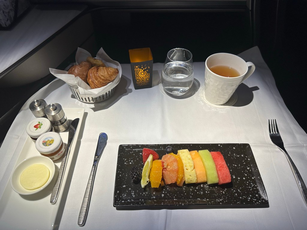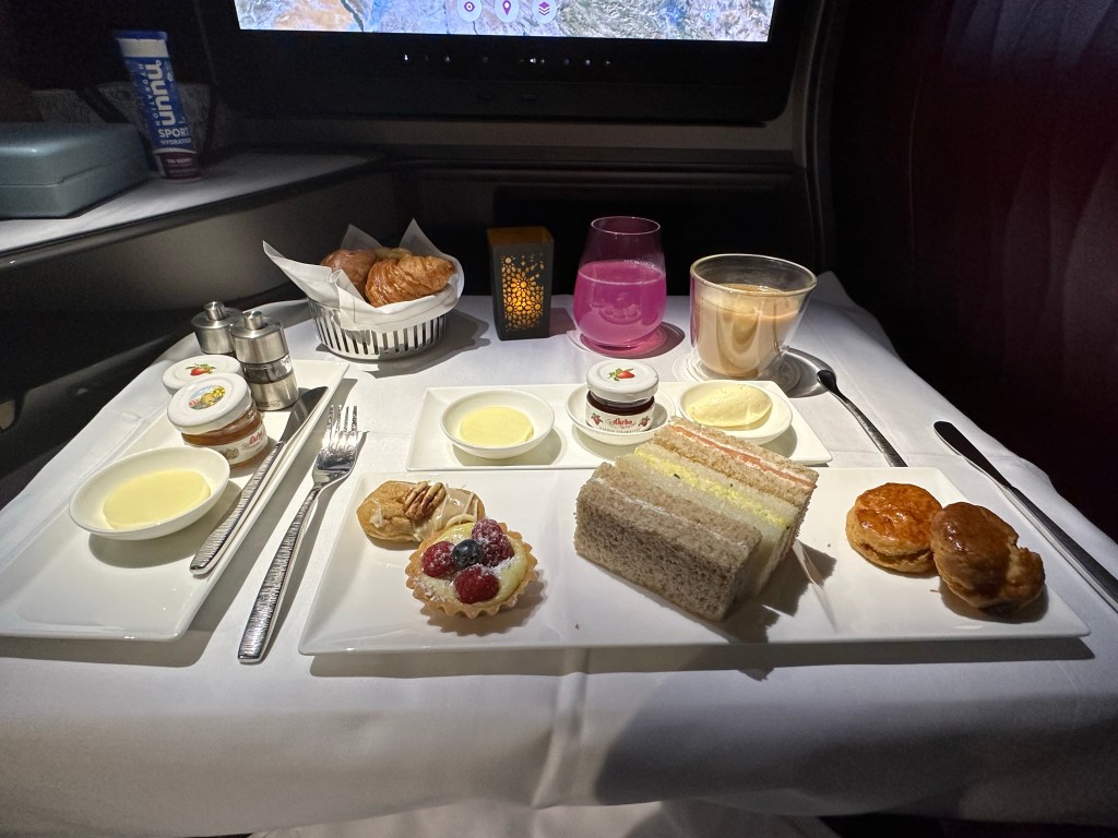 For my breakfast I opted for a mint tea, fruit plate, decaf oat milk latte, and the “afternoon tea” which included finger sandwiches, scones, tarts, and pastries. It was good but not as amazing as dinner.