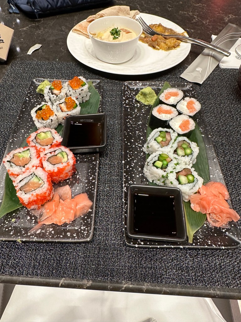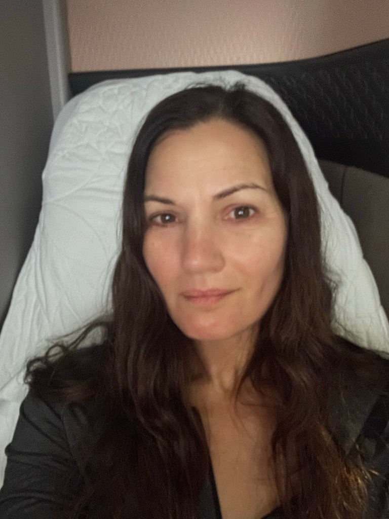 I had planned to skip dessert anyways so the sugar didn’t keep me up but even if I had wanted it I was so full after my first three courses that I couldn’t have made room for it. When I went to brush my teeth I let the staff know I was ready to sleep and before I was back to my suite they had laid the bed back with a mattress pad cover and full sized pillow. Instead of dessert I had an edible, chased with a sleeping pill, and managed to sleep a solid eight hours! Eight hours of sleep on a plane! It wasn’t deep sleep but it was sleep and I only woke once, when the turbulence bounced me off of my bed as the plane flew over Iceland.