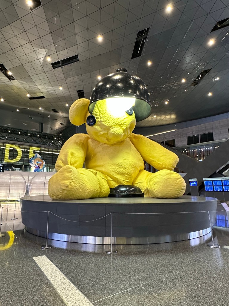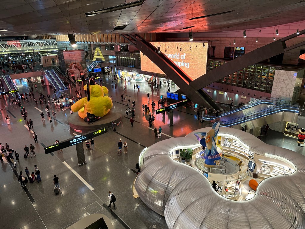 Greeted by the atrium of the Doha airport as I departed my flight, I let my bags balance for a moment to try to snap a picture, barely catching them and myself as they started to tumble down the escalator. Oopsie.
