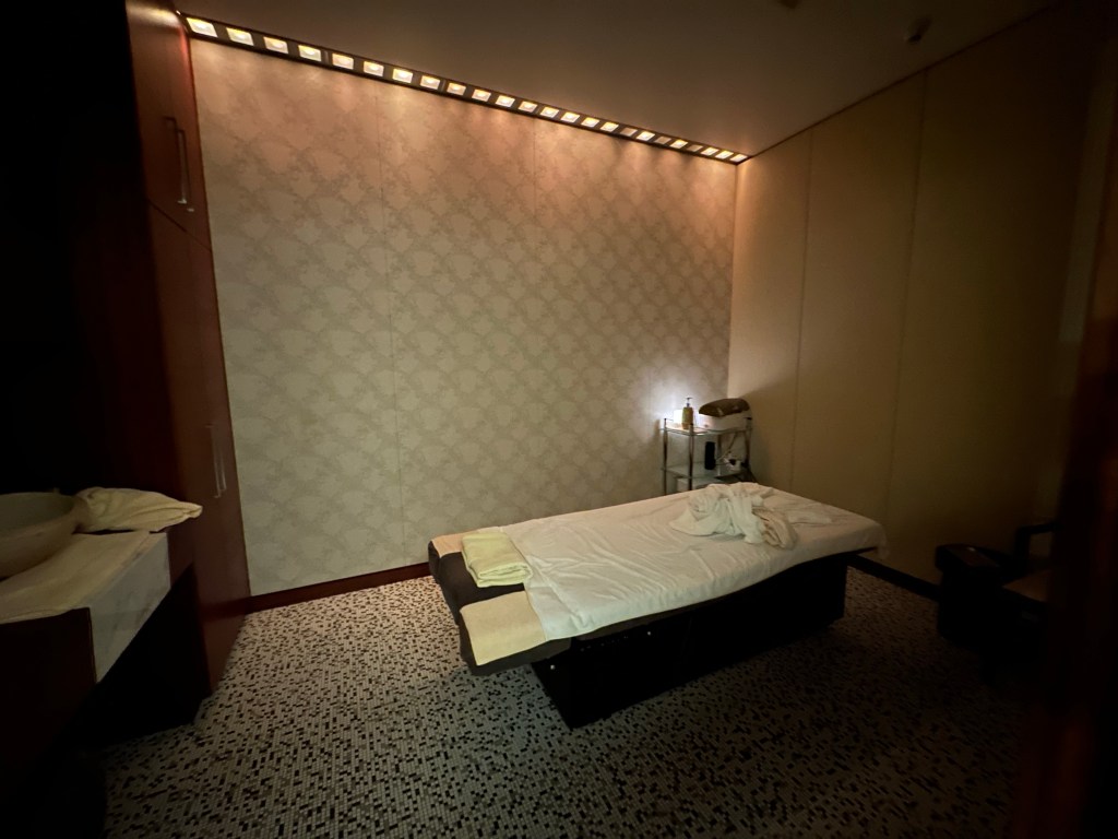 I found my way into the Qatar Airways Al Mourjan Business Class Lounge, secured my bags in a locker, and was disappointed to learn that the Louis Vuitton Lounge, located within the business class lounge, was limited to the highest tiers of Qatar Airways status holders. Damn it. I consoled myself with some sushi before leaving the lounge to find the Vitality Spa, conveniently located near the giant creepy teddy bear statue and one of the Louis Vuitton stores in the central terminal. And I may have also found a bottle of a new Louis Vuitton perfume scent that I’ll have to pick up on my way back home in a couple weeks.