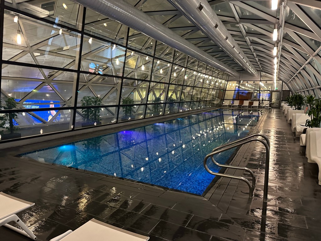 With a 7 hour layover I figured that an 80 minute aromatherapy massage was a necessary way to kill some time. There is a pool in the spa as well. I’m not much of a swimmer and I had packed my swimsuit in my checked bag but the opportunity to swim in a pool, in an airport, felt necessary to embrace. For $38 I bought a terrible bathing suit at the spa before heading into my massage.