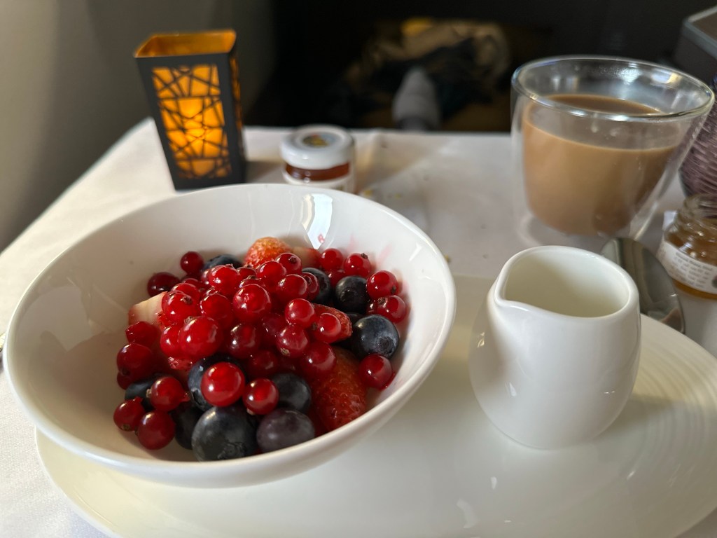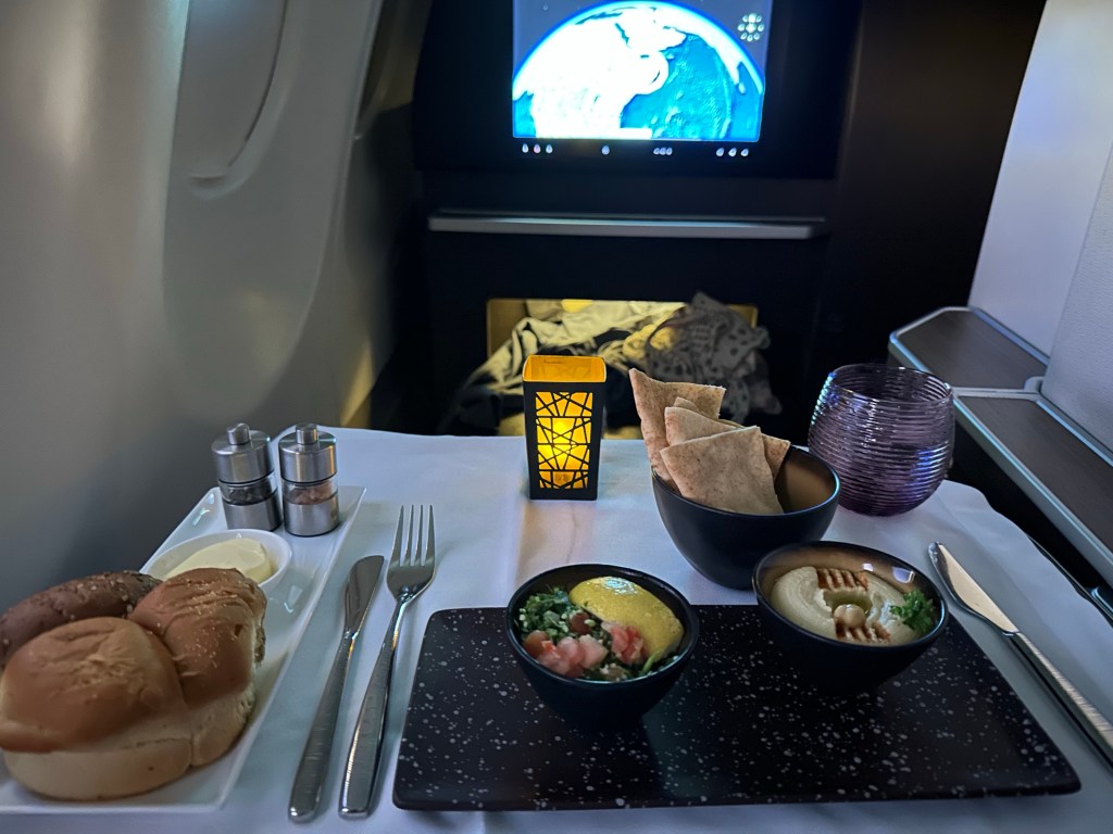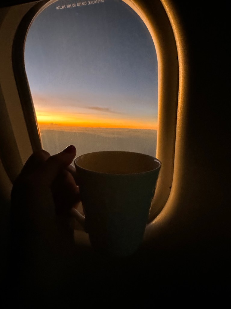 I rang for the flight attendant to let them know I was ready for breakfast and Ronald came bounding to service like an excited puppy. My Arabic mezze of hummus, tabouleh, and Arabic bread, followed by a cheese plate, and ultimately a berry salad, with mint tea and two decaf oat milk lattes with honey hit the spot. The fruit salad was heavenly; fresh and chilled it was what I didn’t realize I needed. Strawberries, blueberries, and tiny cranberries with a light rose syrup made me so so happy. By 5:40am I was feeling awake, watching out the window as the sun rose over Africa, clouds sharp and curled like crashing waves.