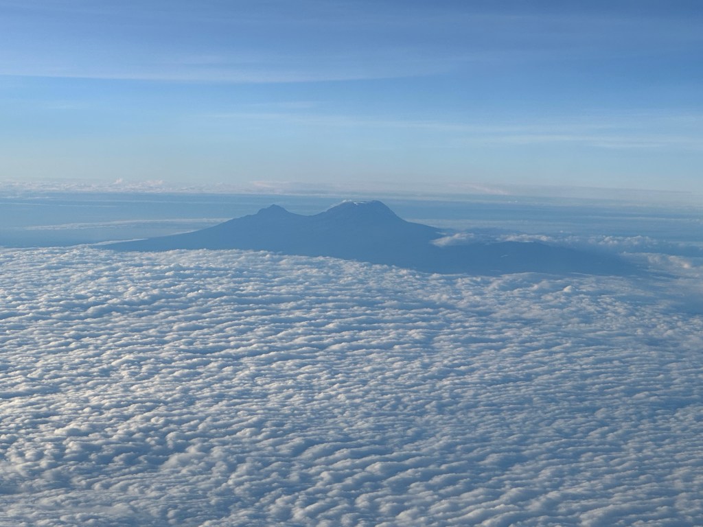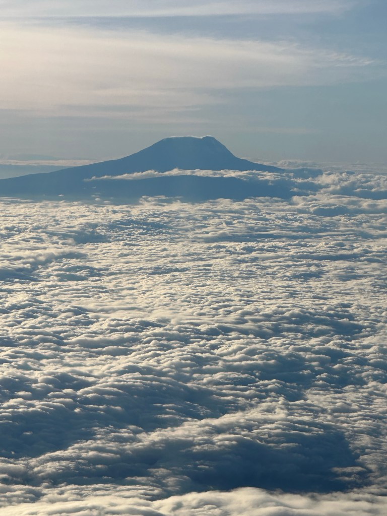 As the crew began to prepare the cabin for landing I looked out the window and could feel my eyes widening and my jaw dropping. Holy shit, there she is. Mount Kilimanjaro rising above the clouds. At eye level. Holy shit, this is insane. This is absolutely insane. There is NOTHING like being EYE LEVEL FROM AN AIRPLANE with the mountain you are about to spend eight days climbing to make you absolutely sick to your stomach.