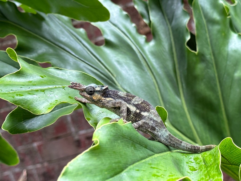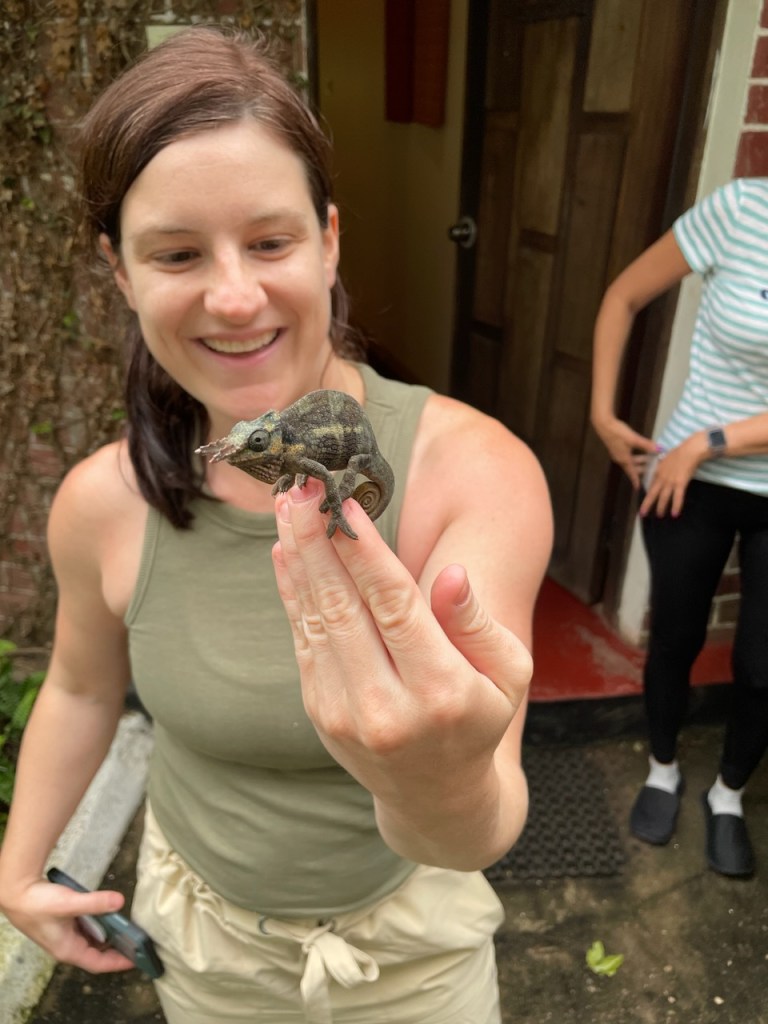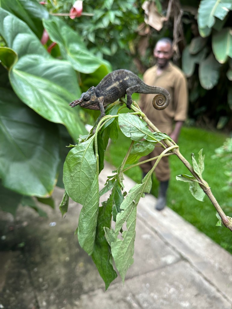 Startled by a knock on my door, I got up to answer and found two of the lodge workers standing in front holding out a giant leaf with a chameleon on it! One gentleman held the frond out at arms length while the other stood further back. Katie vocalized all our excitement with a squeal and reached right for it, confirming it wasn’t poisonous, and then going in with her hands to hold the curled tail, horned fella.