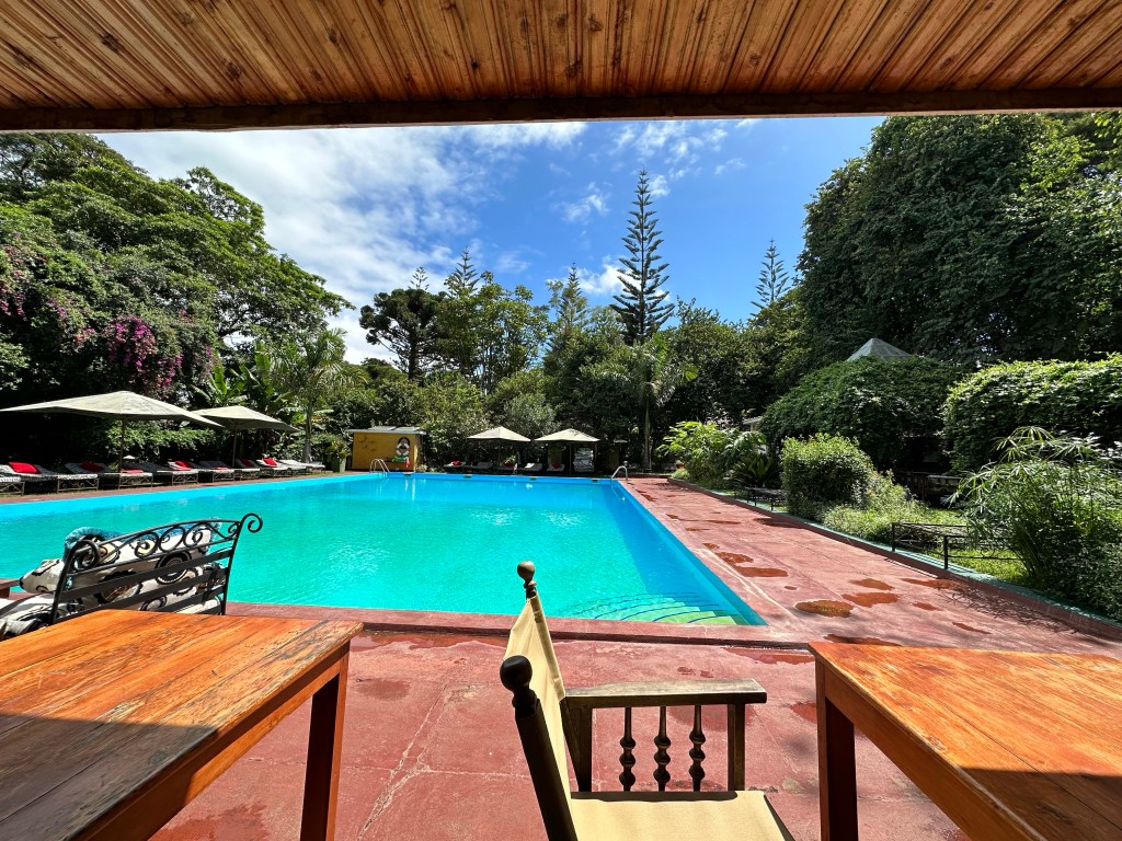 Babu eagerly took my tea order and I sauntered over to check out the other side of the garden where a sheltered area with seating and a fireplace looked inviting. An older gentleman sat alone at the table on the end of the pool deck. Earlier I had heard him mention to Babu how much food he ate on the way here from London so I greeted him warmly, made a comment about eating in transit, and we started chatting about our travel days to Tanzania.