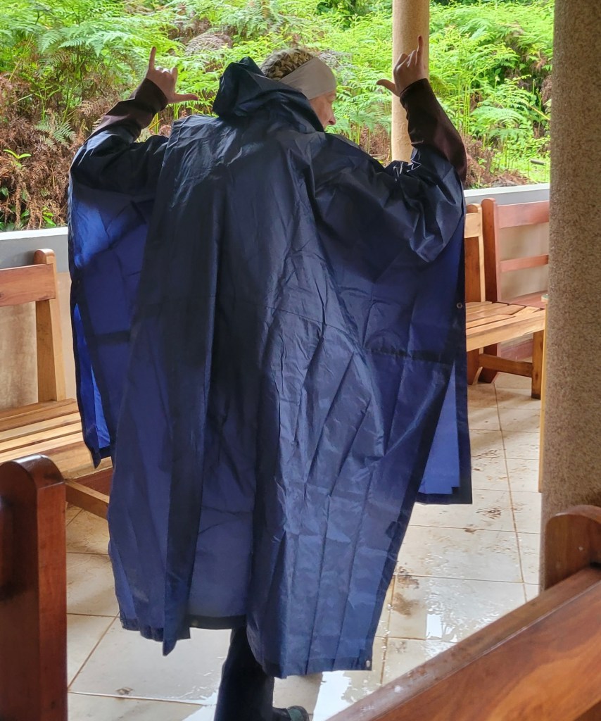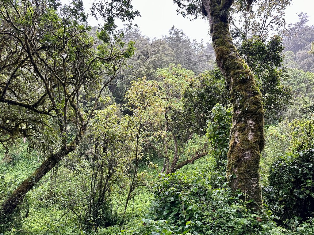 It was raining from the time we arrived at the picnic area and that rain never let up. I guess we are in the rain forest after all. Technically we are in the Rain Forest climate zone now. Shane had the first monkey sighting, more colobus monkeys flowing from the trees, damn he’s good. He and Kyra are pro spotters. We made the best of the rainy hike laughing, joking, discussing the beautiful terrain. When we hit the 8,560′ elevation range, Shane pointed out that we still had over 11,000′ to climb. We’d climbed about 1,100′ by then!