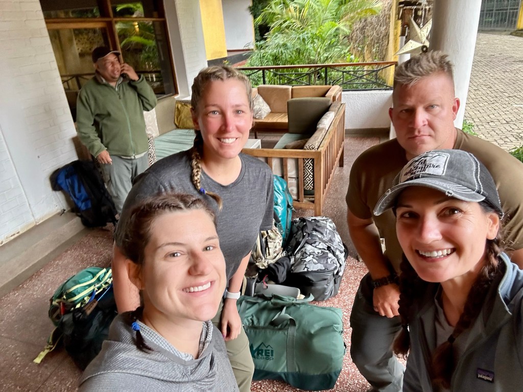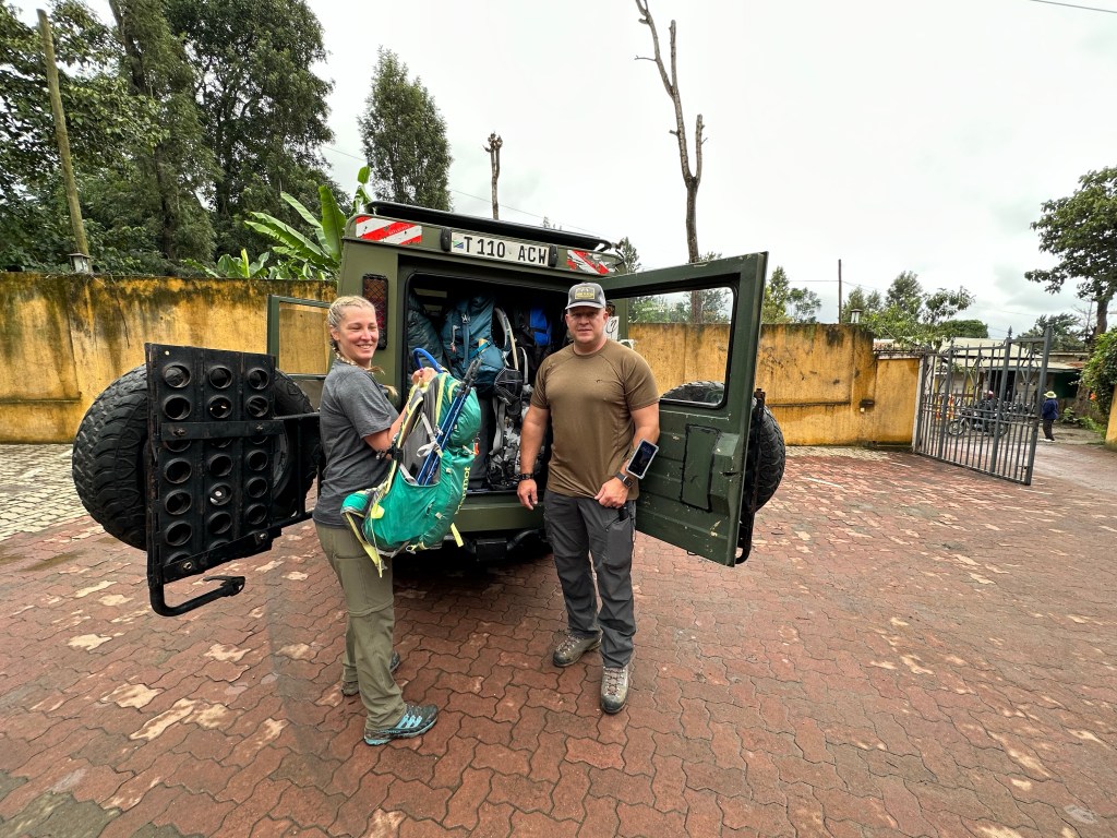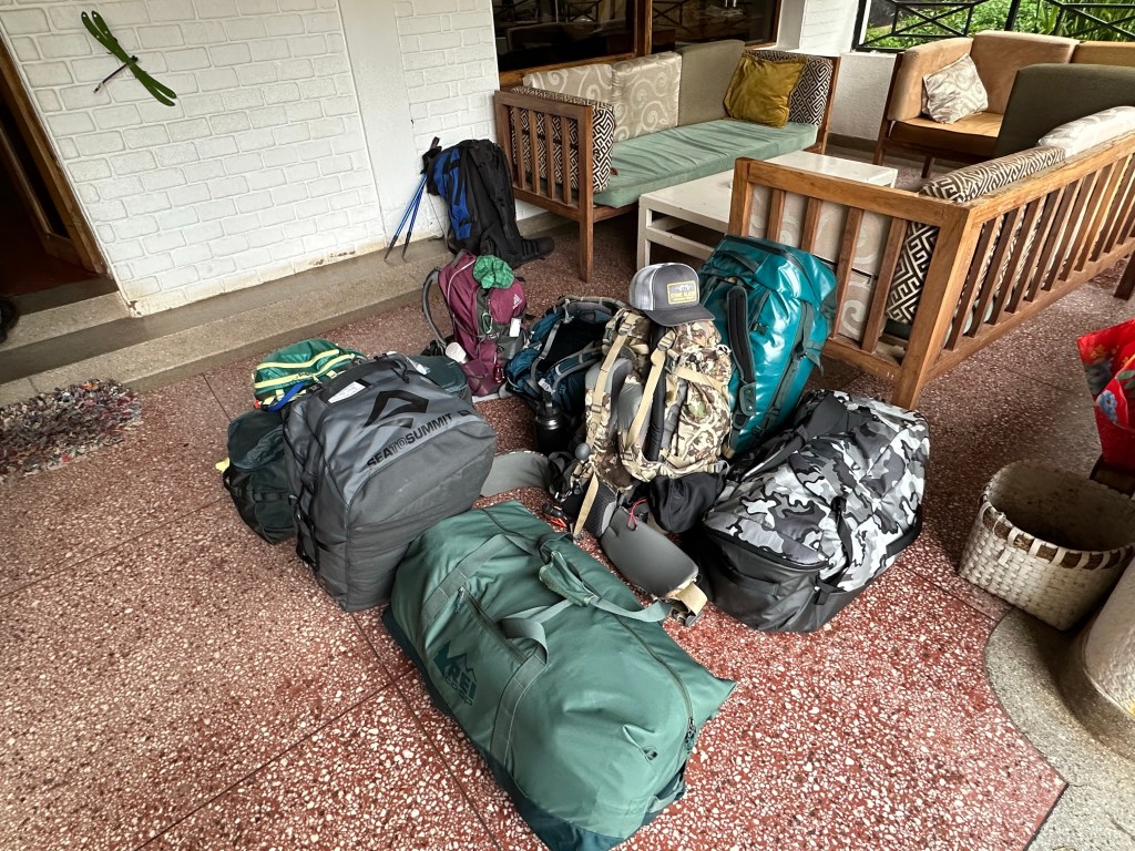 By quarter to eight, lodge staff was waiting outside of our row of rooms to carry our bags to the front. We each had our daypack, our mountain gear duffel, and our safari/travel luggage. Plus Kyra and I had an extra mountain gear duffel we are sharing since our sleeping bags were bulky and trying to make all of our gear fit in one 90L duffel each wasn’t going to happen. It also gave us some extra leeway on weight since each duffel is limited to 15kg/33lbs. Saidi and Solomon were waiting for us in the lodge sitting area and we piled our day packs and mountain gear in front while we handed off the rest of our luggage for storage at the lodge while we’re on the mountain.