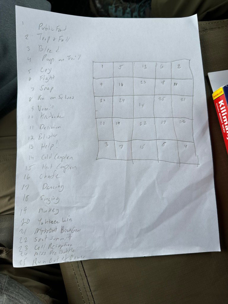 Driving through the fertile land of the cultivation zone, the first climate zone of Kilimanjaro, we admired the landscape full of corn and potato crops while we worked on our items for Kilimanjaro bingo. Our five by five bingo board includes milestones such as first to publicly fart, trip and fall, bleed, poop on the trail, cry, snap, pee on themselves, vomit, need help, and so on.