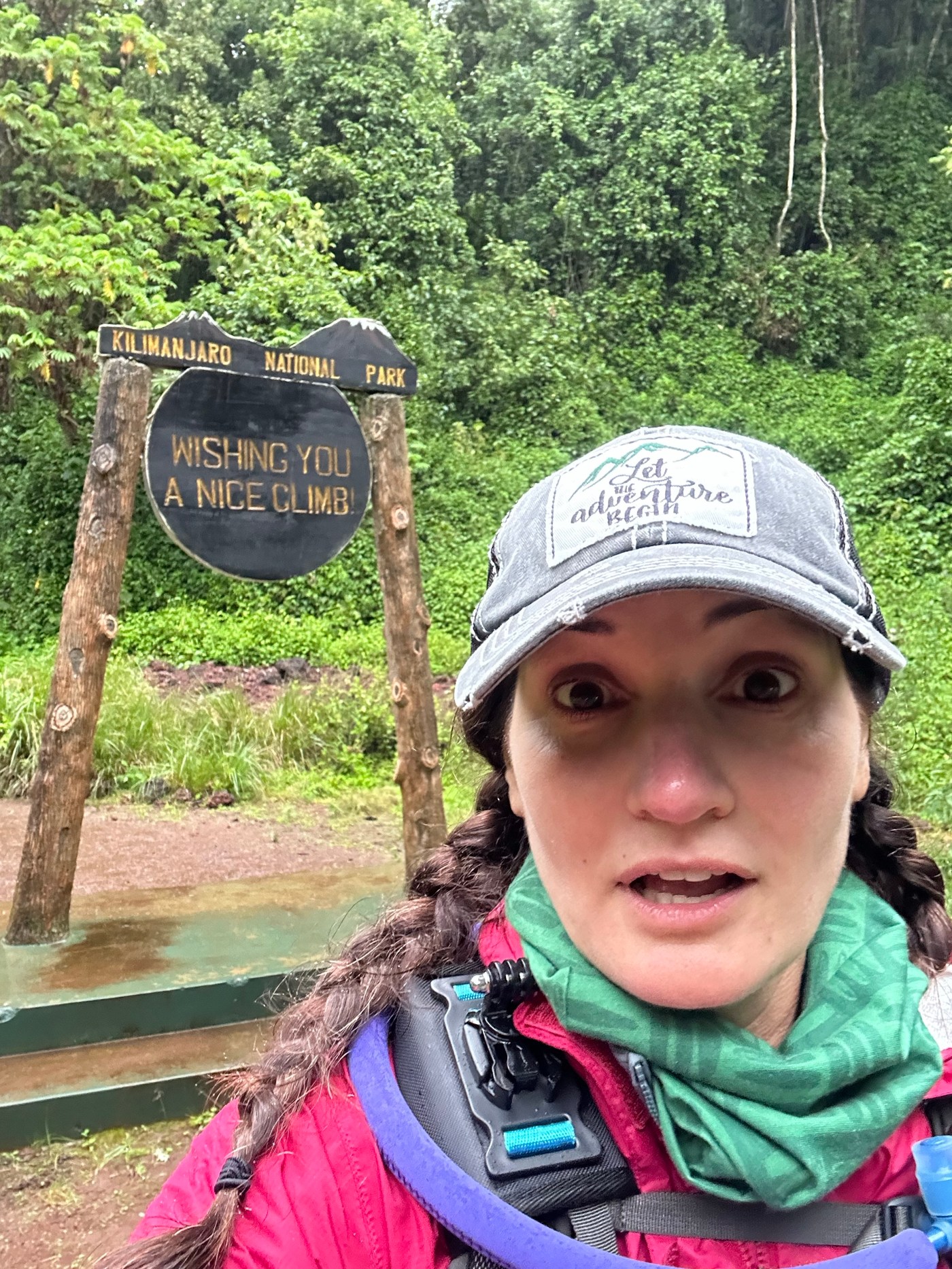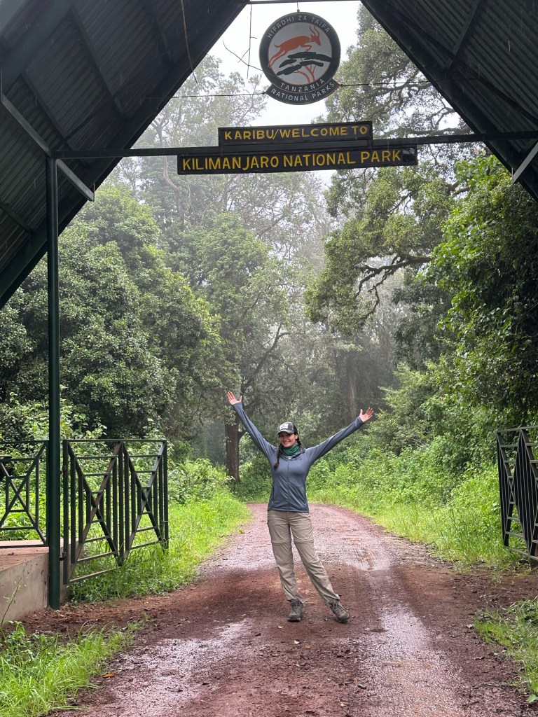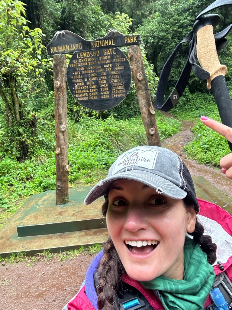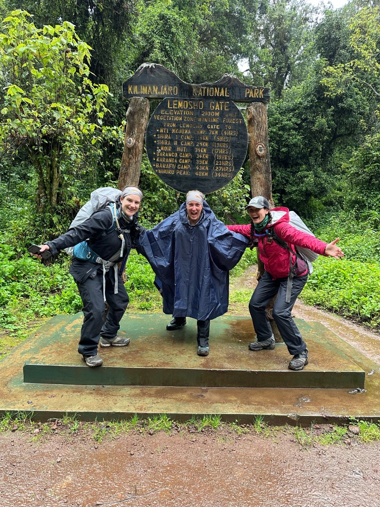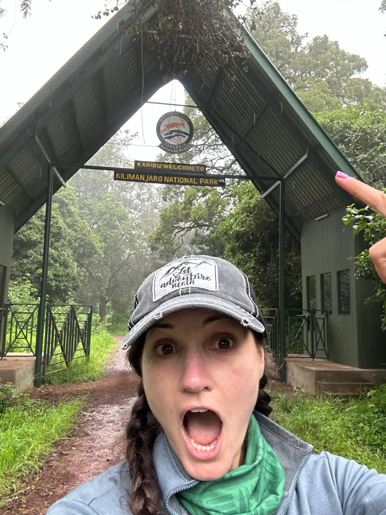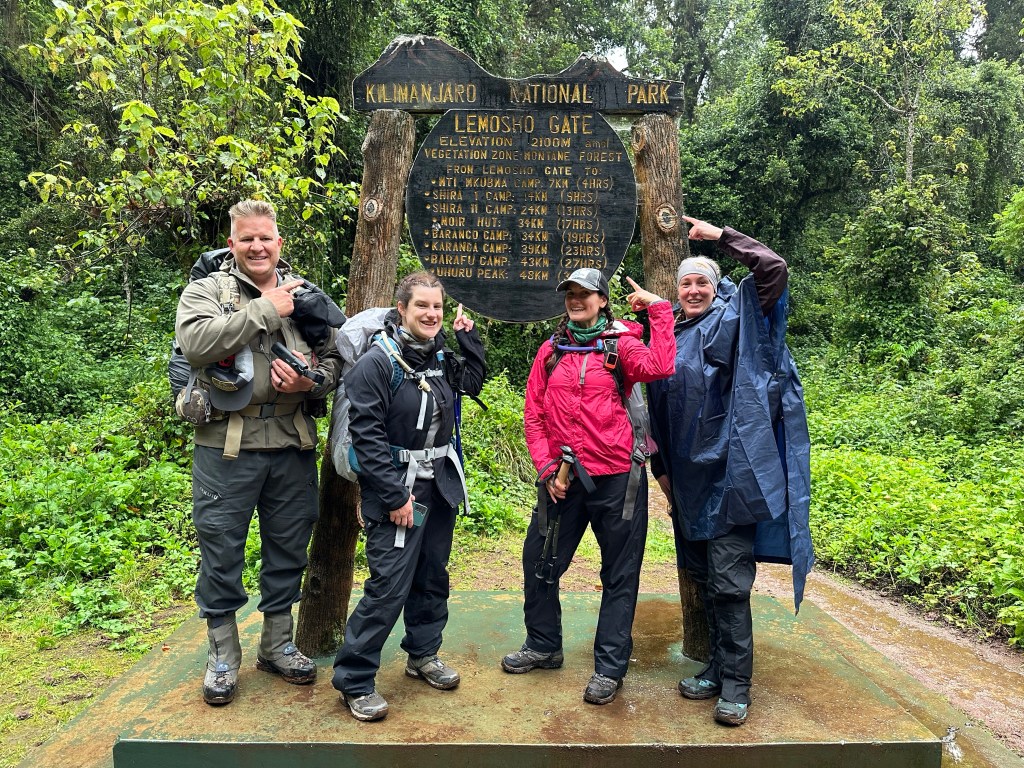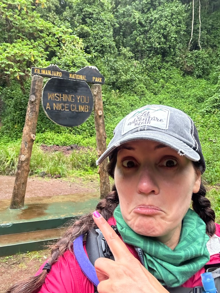 Ten minutes later we came to the official “Lemosho Gate” sign, I’d been disappointed there wasn’t one until we saw it, and we were all giddy because now it FELT real. We hopped up for all sorts of iterations of pictures and I did a little jig, which would be the first of many times (spoiler alert) that one of us would think we were recording something only to realize we hadn’t actually hit record. The back side of the sign read, “Wishing you a nice climb” and it hit me that I am really doing this. Like for real, for real. Like right NOW.
