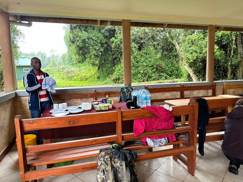 It was raining as we parked at the Lemosho Gate ranger station and picnic area at 12:30pm. Porters immediately showed up and began whisking our bags off to their preparation area, it was all happening so fast! Saidi led us to a sheltered area with picnic bunches and told us that we should get our gators and rain gear ready while he went down to finalize preparation with Chaz and our team of porters.
