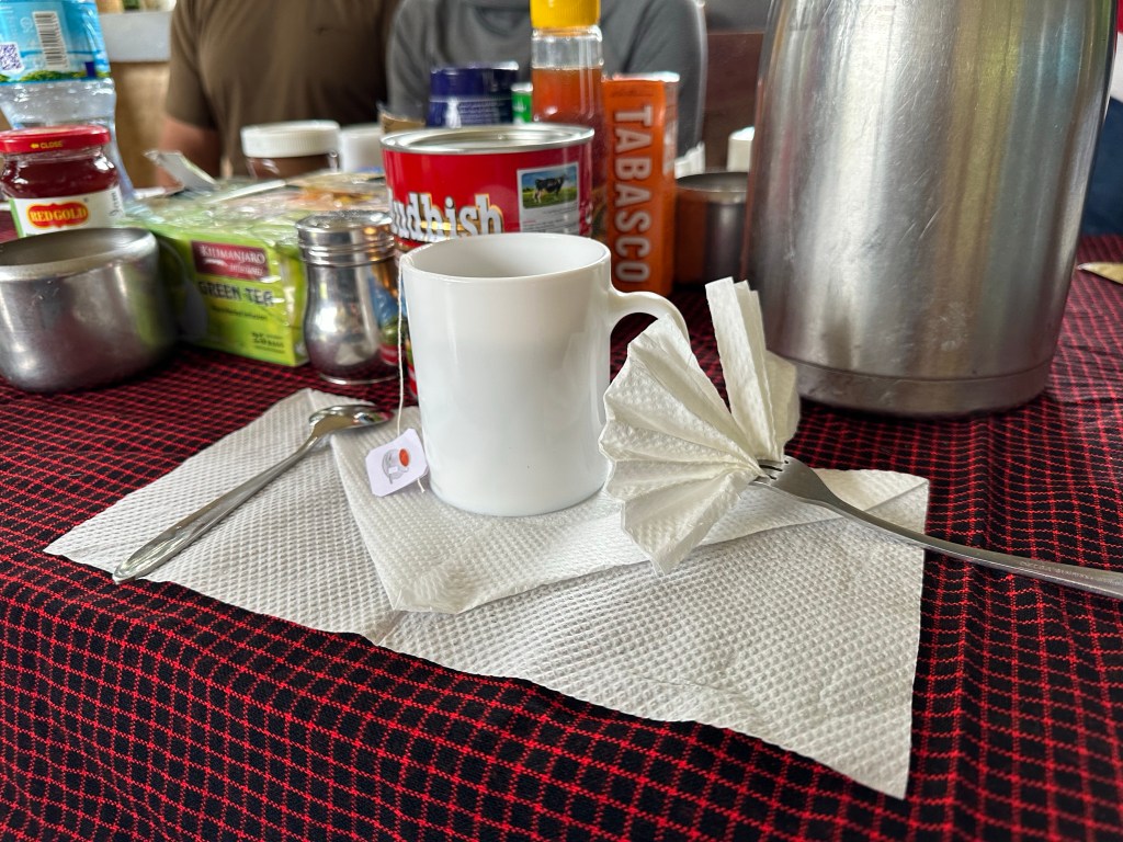 We chatted with two Aussies who were also getting ready with their guide. They are going to be on track with us for the first three or four days but then they are taking the summit route up the Western Breach, meaning they will summit a day after us and their trek will total nine days. Their lunch table setting wasn’t nearly as ornate as ours and their meal seemed pretty basic.