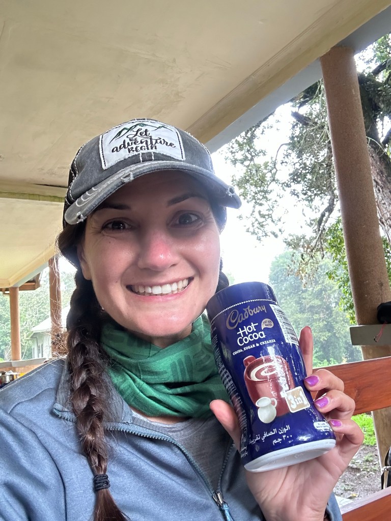 With the sun setting and the ground muddy, I crab crawled into my tent for the first time. My duffel and Kyra and my’s shared duffel were in there waiting for me, along with a mattress pad. I was quickly losing light as the sun continued to sink and pulled out my simplest camp light, realizing it was lightweight enough that I could hang it from the top of the tent. My priority, as directed to us all by Saidi, was changing into dry clothes. But first, Essau brought us each a bowl of warm water and little bar of soap for “washy washy.” I used the warm water to wash my hands and face and tried to dip my feet in for a treat for the toes but it wasn’t really wide enough. The rest of my body I washed with wipes. It felt so good to get into warmer drier clothes.