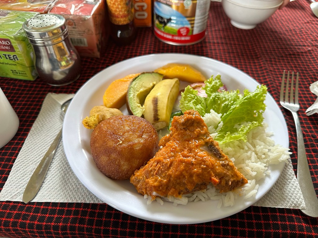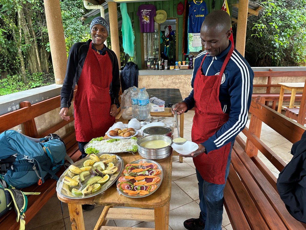 Our lunch was ready and we were introduced to two of our porters, including the gentleman who had set the table, Essau and Kasimu. They were two of the “special” porters that would also serve as our camp waiters. Platters of food and terrines were brought up from wherever the prep area was below and we were served our first camp feast of leek soup, rice, carrots, tomatoes, peppers, beets, chicken, fritters, avocado, mango, bananas, and oranges. As Essau served us he grinned and added more food than we wanted to each of our plates saying, “for first day” each time. The meal was delicious though I wasn’t sure how my stomach would do with the saucy chicken.