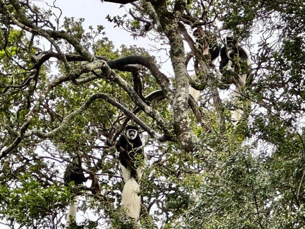 When we were done eating, someone spotted a colobus monkey in the trees near the ranger station. As we oohed and awed from the picnic area, the ranger beckoned to us. Katie and I followed and he led us across a grassy patch and lowered some ropes so we could cross into the closed off area to get close to them. They were right overhead in all their silky skunk gloriousness. I moved out of the way as they hopped directly overhead to make sure I didn’t get peed on.