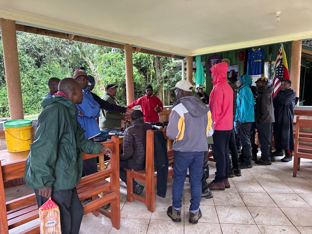In packing for this trip, I made sure to include items that I wasn’t going to use that I wanted to donate to the porters at the beginning of the trek. Honestly, as soon as I got to Tanzania I was extremely disappointed in myself as I had more that I meant to bring but in the last minute stress of packing I forgot so much of it. Kyra had also brought some items to donate as well. Saidi laid all of the items we brought to donate out and counted them, there was enough for every one of our support team to get something. Our cook and 19 porters joined us in the picnic area and Saidi introduced each one. As they were introduced, each got to pick an item from the table. Everyone was grateful and it was obvious that warmth was a priority. It was immediately clear that our donations were impactful and I felt even worse for not bringing more.
