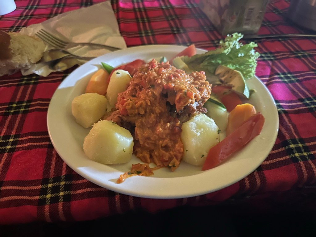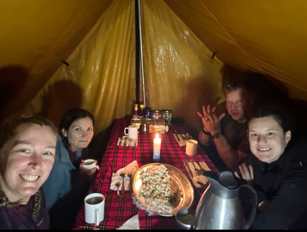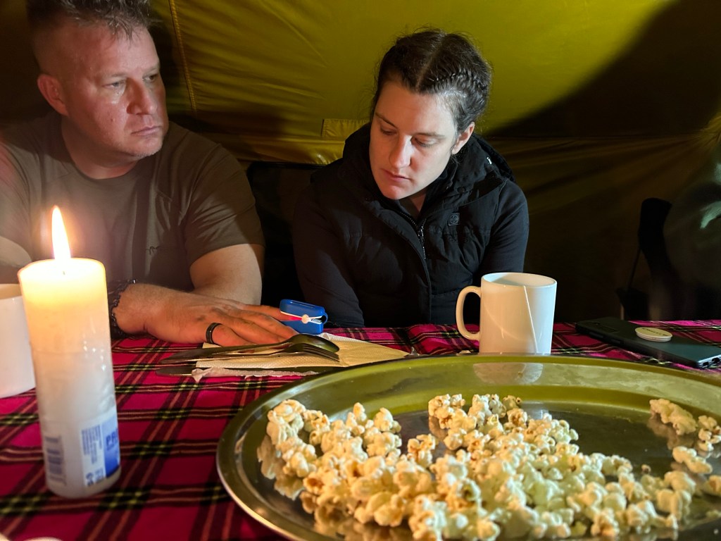 Our dining tent was ready for us and it was about time to do our health checks so I grabbed my awesome mini Ledlenser keychain light. Its better than most flashlights and I hadn’t yet adjusted my headlamp to fit. I was so excited when I walked into the dining tent and a giant silver platter of popcorn was waiting on the table! I LOVE popcorn! It was warm and fresh and perfectly lightly buttered. Just writing this I want to be eating popcorn right now.