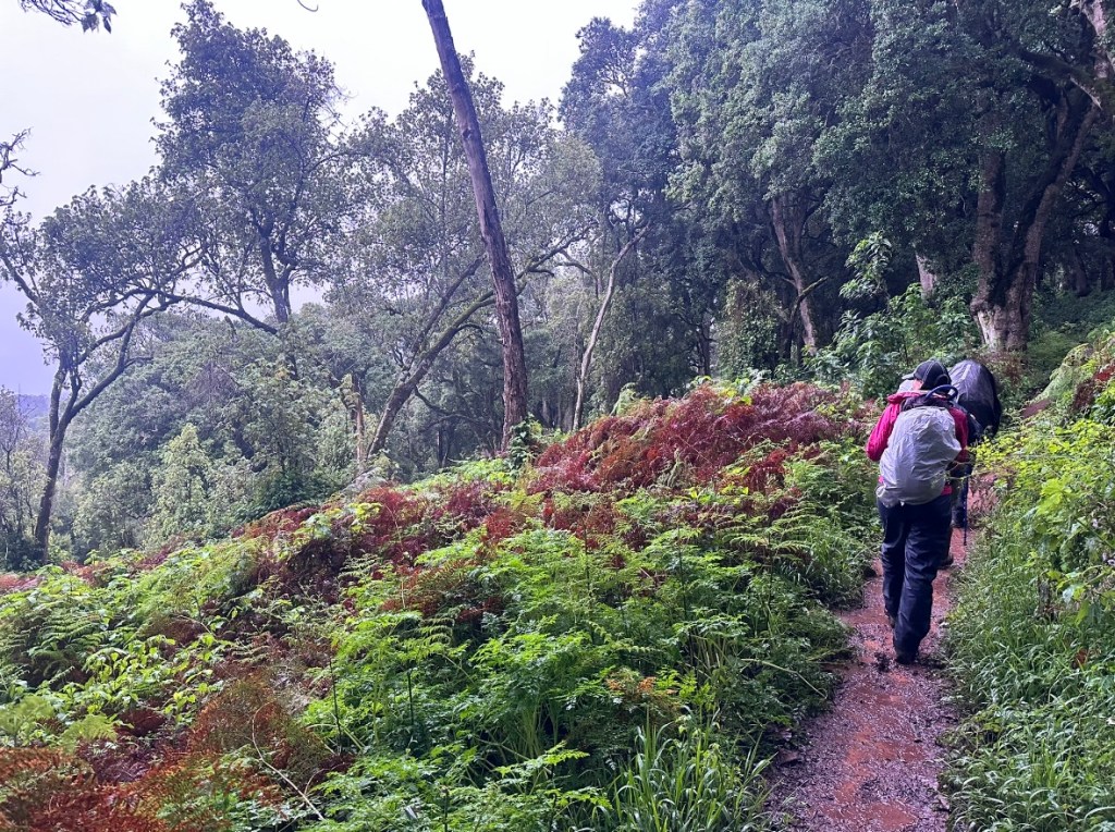 As we took our time following the slow pace set by Chaz for the trail, porters passed us up. They had all still been down in their prep area when we left and this was the first of our porter passings which would be a daily routine of our porters running past us on the trails, ridiculously impressive carrying bags on their heads and backs, practically sprinting across the wet uneven terrain.