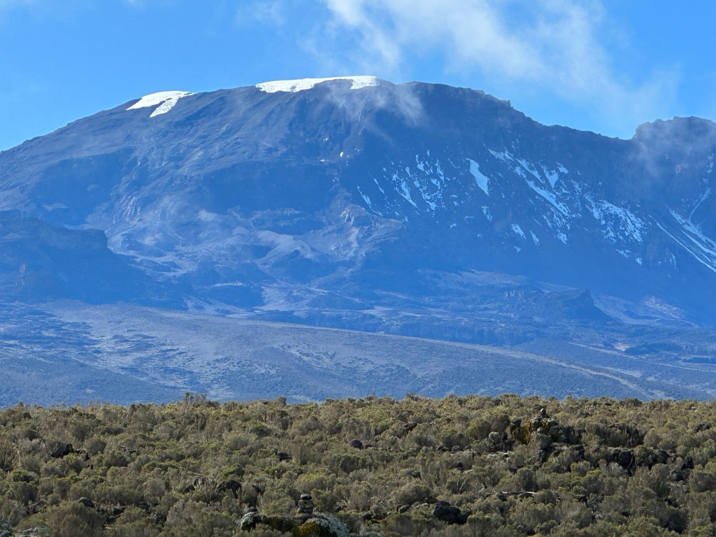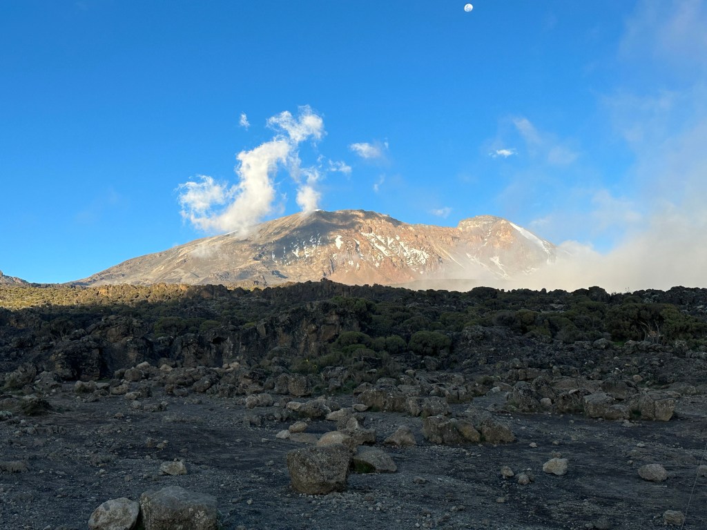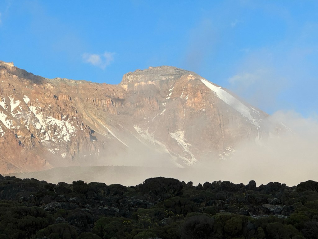 It was 40F in my tent when I woke up, and significantly colder outside. Shane was already up and urged us to come out during our 6:30am wake up call. I figured it was worth crawling out if he was so excited for the view. The ground and my tent were both covered in frost but the skies had cleared with not a cloud to be seen and the sun was rising behind Kibo peak as she and her glaciers were welcoming us to the day. This morning I broke my no-caffeine streak and went with a green tea with honey for my wake-up tea. I deserve it. We aren’t really supposed to have caffeine on the mountain but it doesn’t seem to be as big of a deal to our guides now that we are here so screw it.