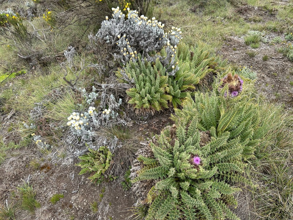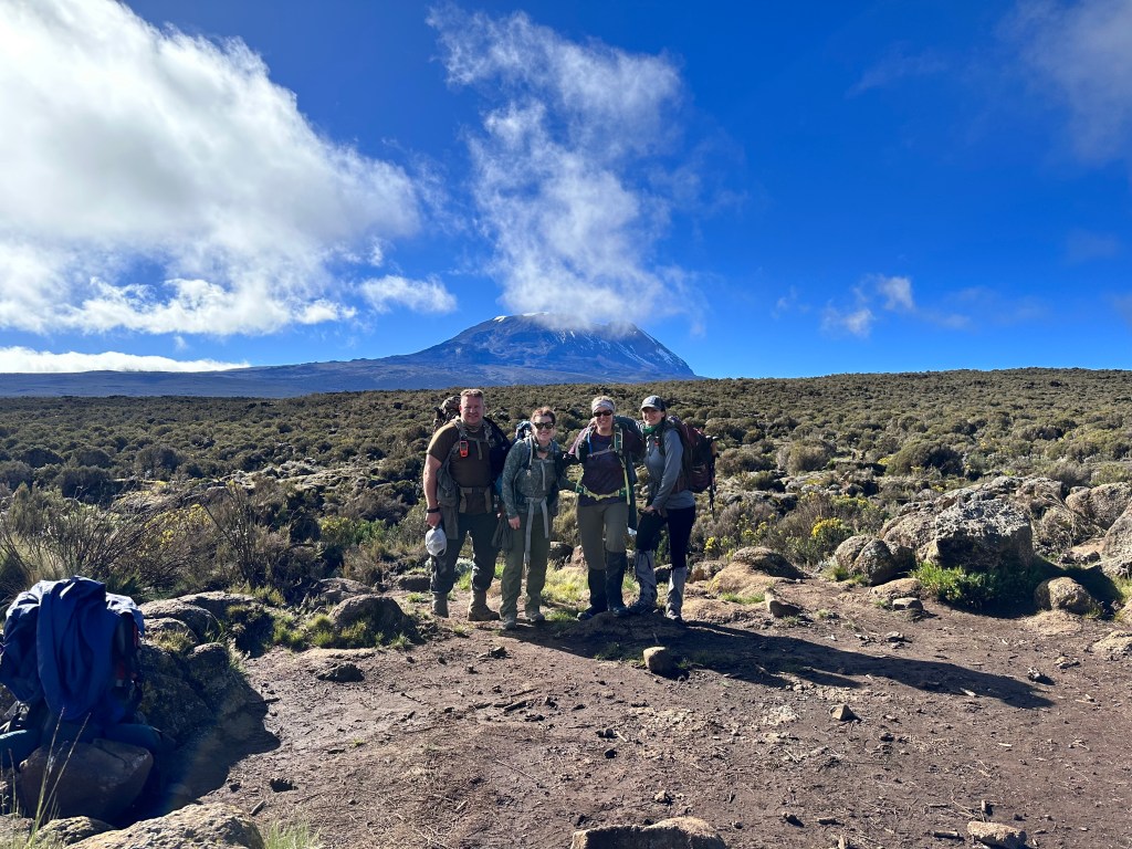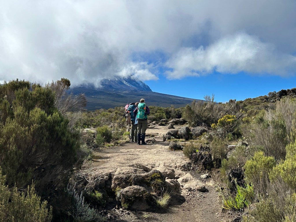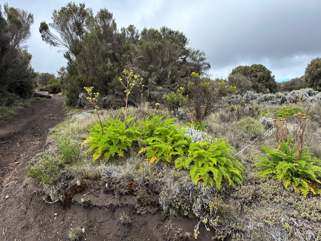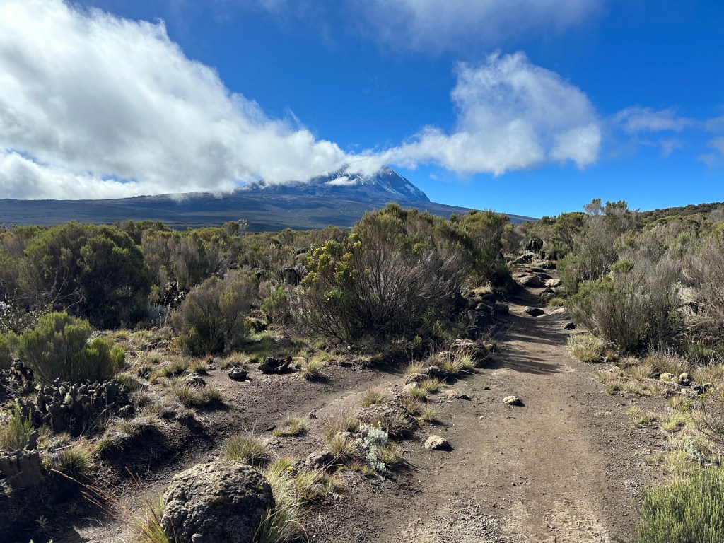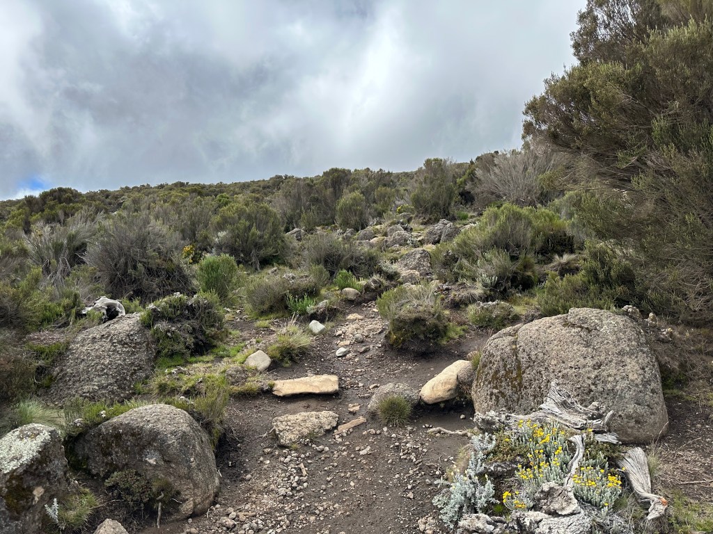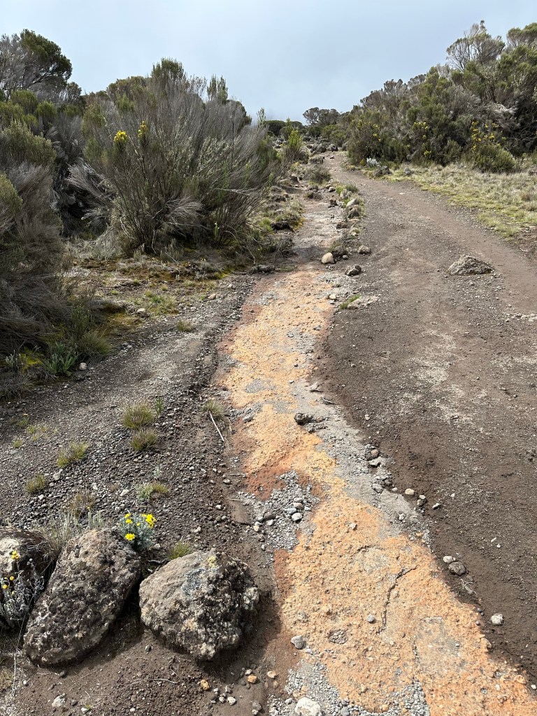 With the flatter terrain the flora was lusher and taller than yesterday. Yellow flowers dotted the greenery and more everlastings blossomed. Spiked cactus-like plants produced little purple flowers in their center. As us ladies lined up for our first pee circle of day, more of a pee line this time really, all our porters caught up to us and started walking by as we were finishing up. Oopsie but I can’t imagine that it’s not a normal site to them. We crossed the rescue road; literally the road that the parks and emergency personnel are able to use when they have to come rescue someone from these “lower” elevations on the mountain. We do not intend to be using this road.