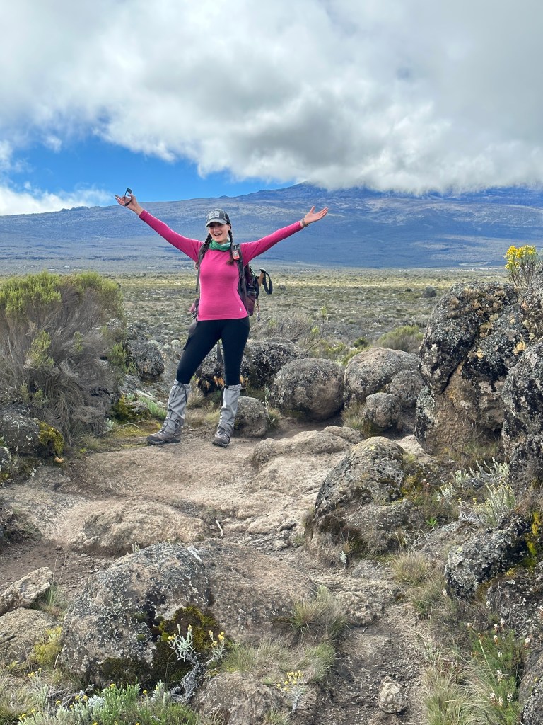 Chaz led the way as we departed Shira I Camp, headed to Shira II. I was thrilled for the sun to be shining down on us as we started our day. We were taking advantage of the sun and hanging clothes and gear to dry; Katie had pants flowing from her pack and I had gloves clipped to mine. Today is an “easy” day – it’s supposed to be relatively flat and meant as an acclimatization day. For the first time, we got to see the everlasting flowers open as the sun is was draws them out of their tight little buds into their spiky shiny flowers.
