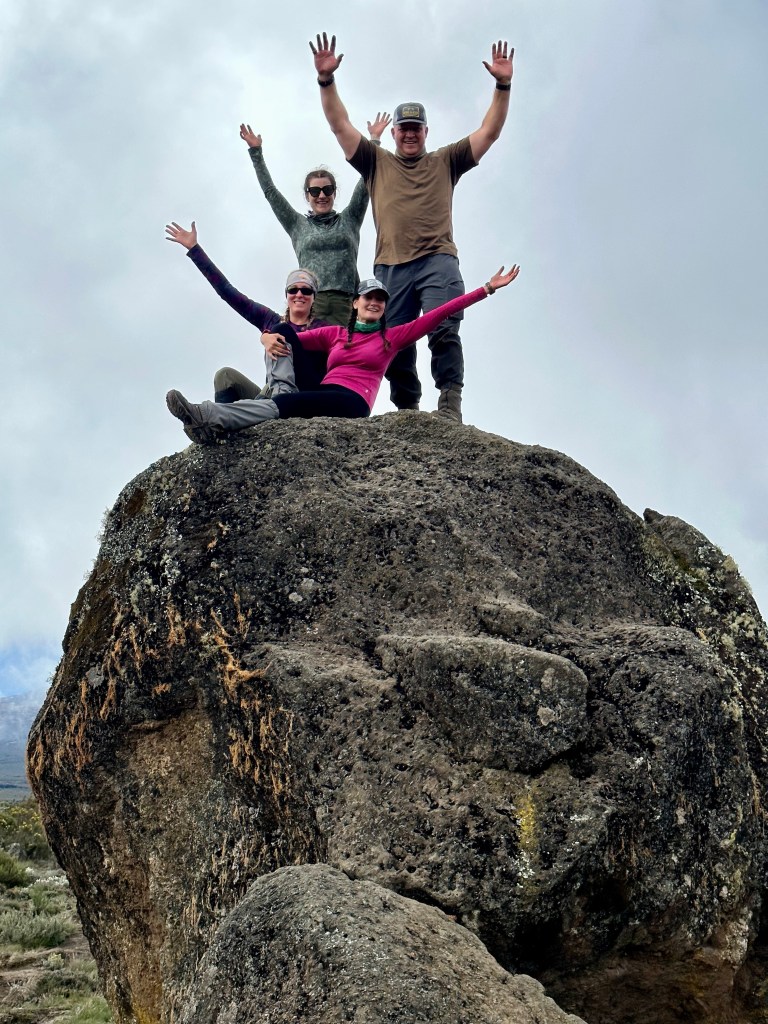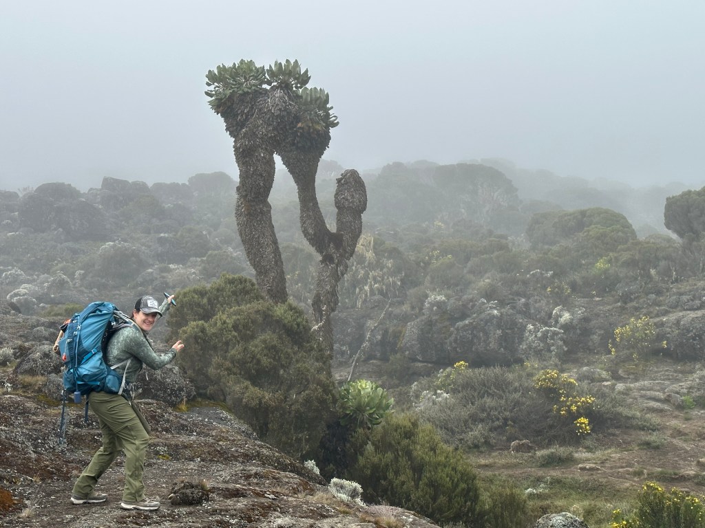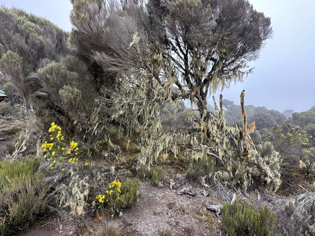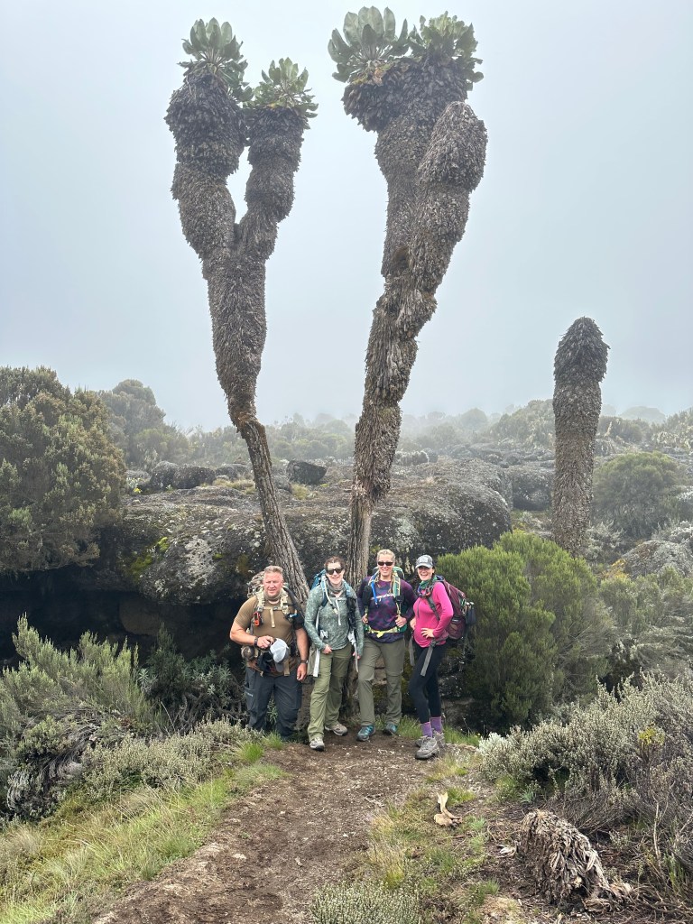 Our resident plant lover, Katie, was so so happy when she spotted her first giant senecio kilimanjari plant on the trail. She had wanted to put spotting the first one on our bingo card but none of the rest of us had any clue what she was talking about so it was vetoed. The senecio kilimanjari is like a funny shaped multi-headed palm tree. Saidi explained that each “head” (my word not his) of the plant indicates 25 years of life. He also told Katie not to get too excited yet because we would be seeing many more much closer on the trail tomorrow. When we got closer to one, Saidi picked up a piece of bark that had been shed so we could feel the soft “cotton” insulation on the back. It was indeed super soft and fuzzy.