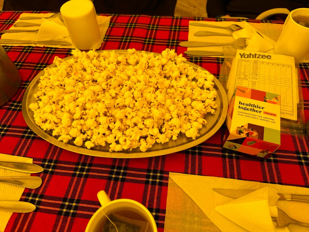 Shane did Shane things while Kyra, Katie, and I converged in the dining tent. Freshly popped popcorn was waiting for us; the best!!! I had Yahtzee and a conversation deck; we opted for the conversation deck, specifically, the Liz Moody Healthier Together Deck – a box of cards with conversation prompts. We sat in the uncomfortable camp chairs, eating popcorn, drinking tea, and learning more about each other with prompts along the lines of “How often is sex optimal?” and “what is the closest you’ve been to death?”