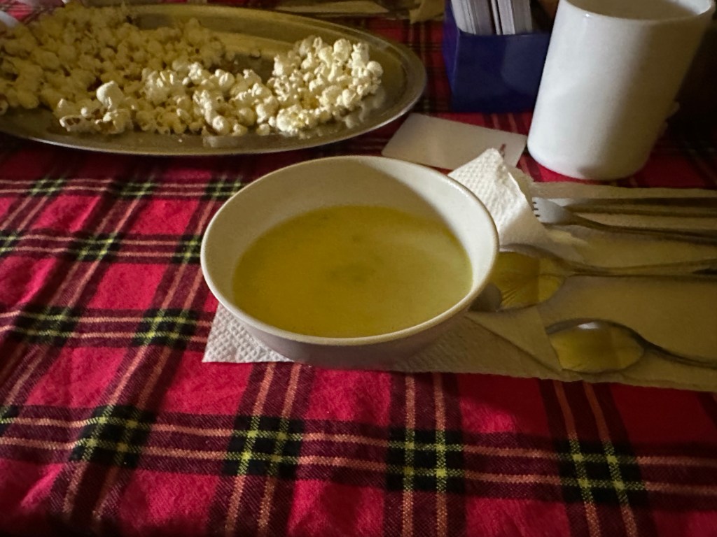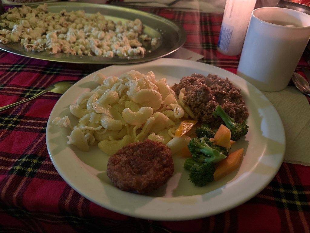 Dinner was leak and zucchini soup to start, with an entree of noodles, steamed carrots and broccoli, saucy ground beef, and banana fritters. Definitely my favorite lunch or dinner so far and easily restaurant quality food. I really want to learn how to make that saucy meat!