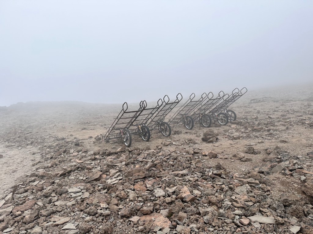 The descent was relatively gradual with rescue wagons stacked up on the side of the trail en masse in some places and individually abandoned in others. It takes six porters to safely wheel one rescue wagon off the mountain. As a group we took solace in the fact that at least we were all walking on our own two feet. As sick as I am, even my ego couldn’t handle the thought of having to be wheeled down.