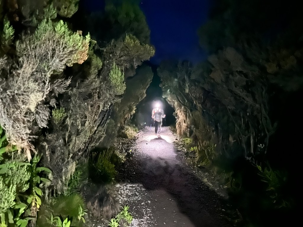As the sun sunk lower and dusk teased the coming of night, the man-made path continued. With brush on either side there was no way around it. We took very few breaks and kept on trucking, now with our head lamps illuminating our path. As the sky grew dark the trail grew creepier and creepier. Spiders dropped from trees around us, swinging on their silks. Thanks to my lack of depth perception, the uneven steps grew into greater obstacles lit only by our headlamps and with each step it was a struggle to make sure I didn’t fall; my body had nothing left it in and my balance was no longer an ally.