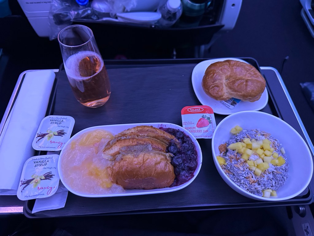Flying here was uneventful, an easy eight hour flight from Honolulu. I’ve only flown direct from California before but breaking it up and taking a day flight actually worked out pretty well. With a shorter flight that didn’t require sleeping all I needed was a premium class seat to be happy. Brunch on the flight also helped keep me happy with chia seed pudding, French toast with peaches and berries, a delightful sparkling rose, and a stewardess walking up and down the aisle chiming, “Bakery?!” in a sing song voice straight out of a Disney movie, while hocking croissants and toast. I could feel the sugar high surging through me as I devoured the sweet breakfast, not a meal I would normally indulge in.