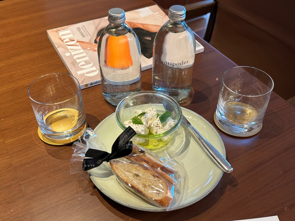 This is my first time staying at the Park Hyatt Auckland and it is lovely. My room was upgraded to a nice corner harbor view suite and they even got my feather-free pillow request right! Even more excitedly, there was a welcome amenity set for me, marinated buffalo cheese and grilled bread, the cheese being local from the Clevedon Buffalo Co and marinated in garlic and thyme. A dark chocolate toasted coconut bar was a secondary treat, laid out on the bed. I settled into the lovely room and sat down to try this cheese. O.M.G. It is maybe the best cheese I have ever eaten. It spread like an airy marshmallow cloud onto the toasty bread and was heaven on the tastebuds. I already reached out to Clevedon to see if they do any type of farm visits and am scheming to see if I can get any home.