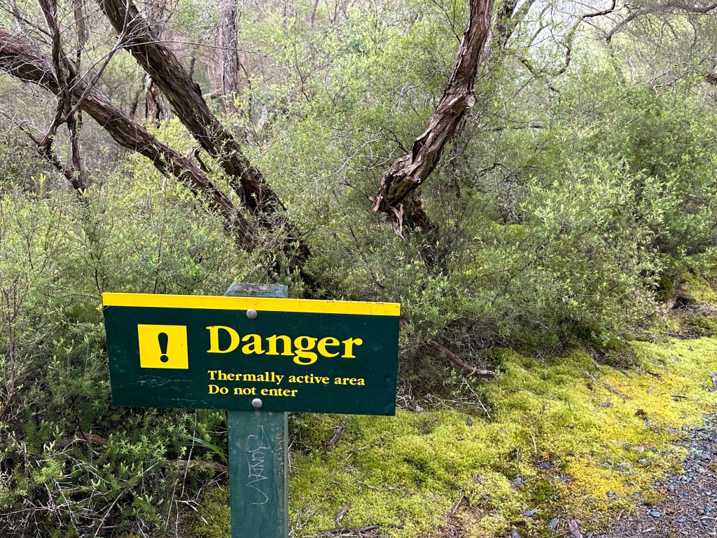 I turned off the highway just before Turangi and arrived at the Tokaano Thermal Walk. There are also hot springs there but they look super cheesy and low brow so I have no interest in using the public pool of a hot spring but the thermal walk begins right by the entrance. Crossing the little bridge from the parking lot I could see rainbow trout in their spawning stream below and hear bubbling mud. Turangi is a big rainbow trout area. I smiled at the warning signs (I love a good sign warning of the danger of thermally active areas) and completed the brief Tokaano Thermal Walk loop. The boiling mud and steaming hot springs were my first real geothermal action this trip and set a great tone for the day.
