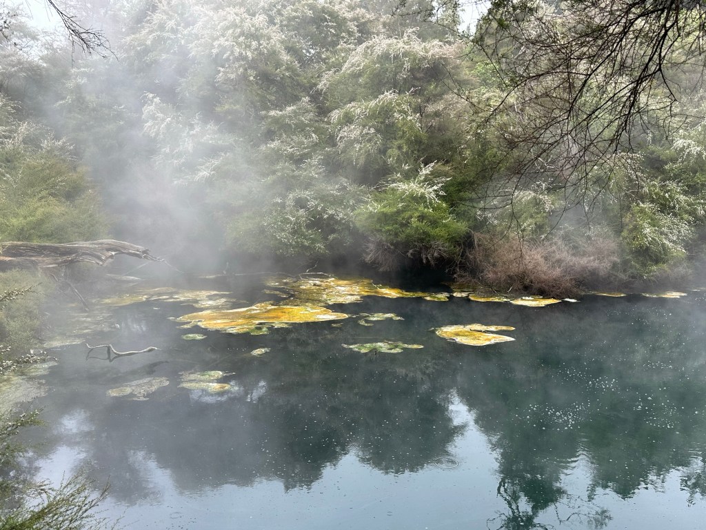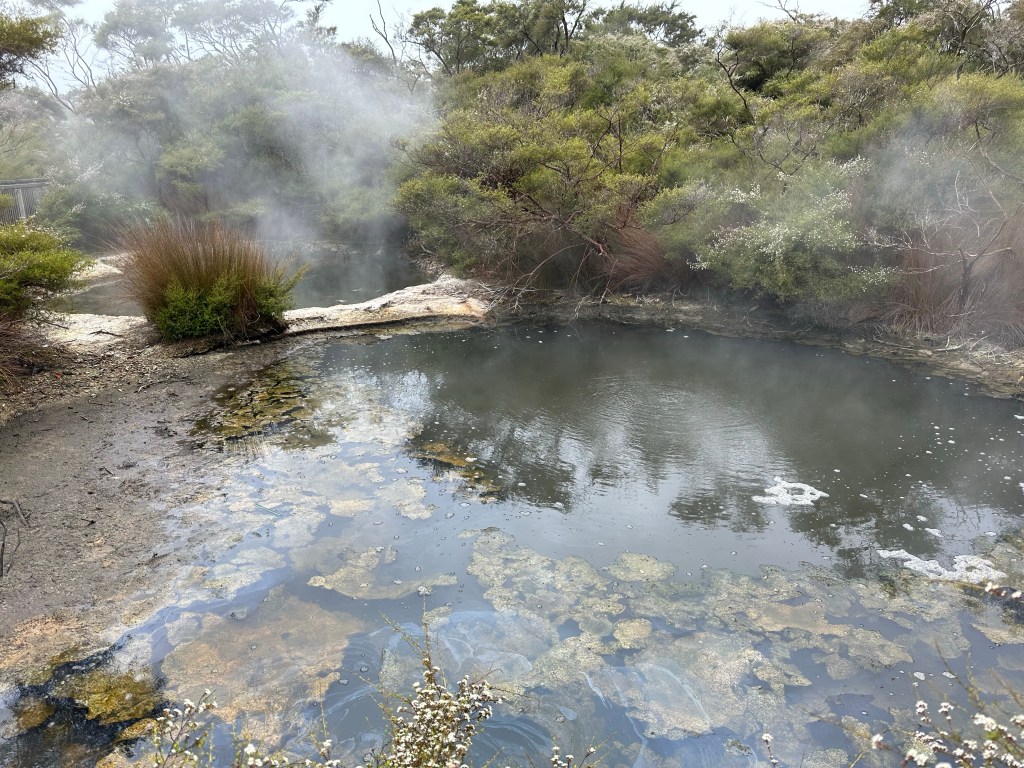 Another day, another pair of black leggings. I feel silly that I even bothered to pack shorts and more than a couple tank tops because it’s been all pants and long sleeves in this weather. Speaking of the weather, it’s raining again. At least I got my little Treehouse cottage warm enough last night that it was still comfortable in the morning and I did not have to attempt to start a fresh fire. Today I leave Raurimu and head towards Rotorua where I’ll spend the rest of my nights this trip. It’s about a 2.5 hour drive that goes through Turangi and Taupo and I have quite an itinerary of stops put together for today: Tokaano Thermal Walk, Turangi Bakery, Tongariro River Loop, Airplane McDonalds, Huka Honey Hive, Huka Prawn Park, Huka Falls, and Orakei Korako Geothermal Park.