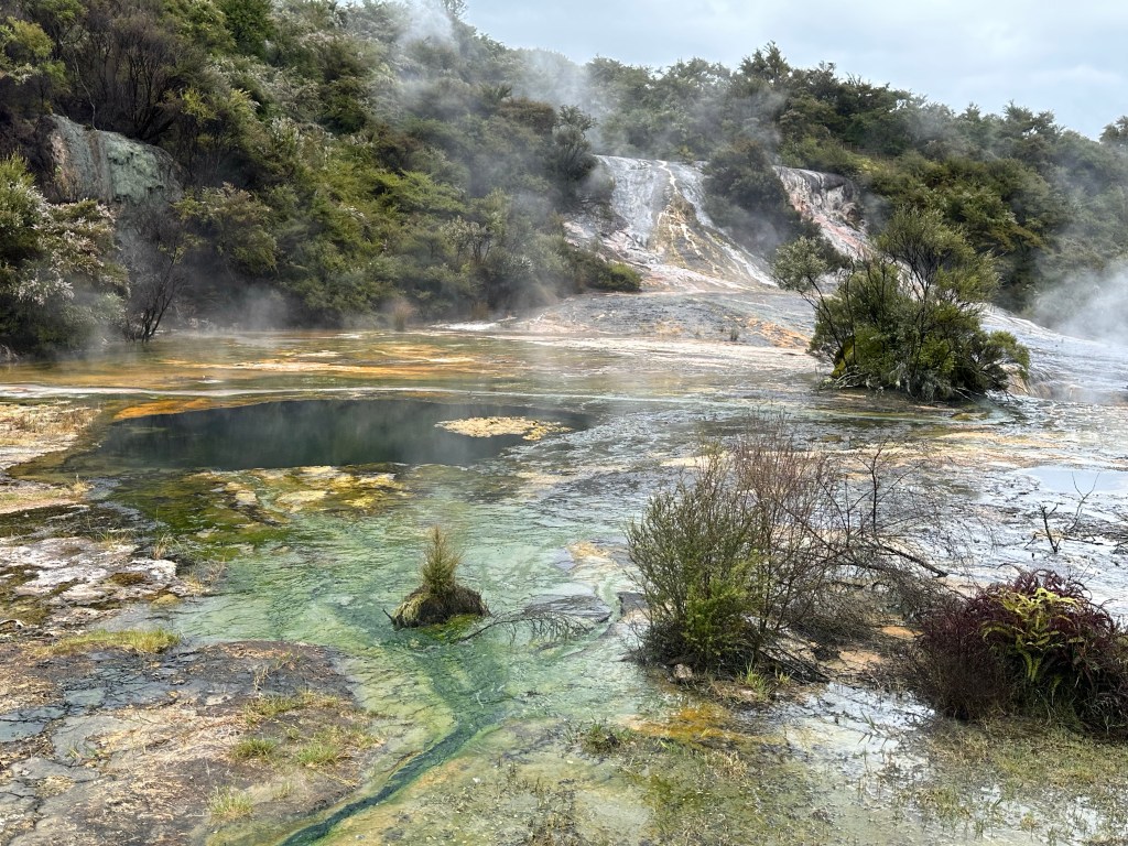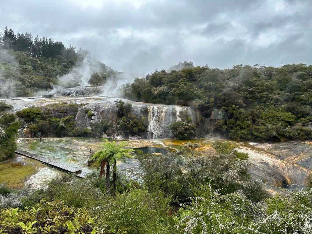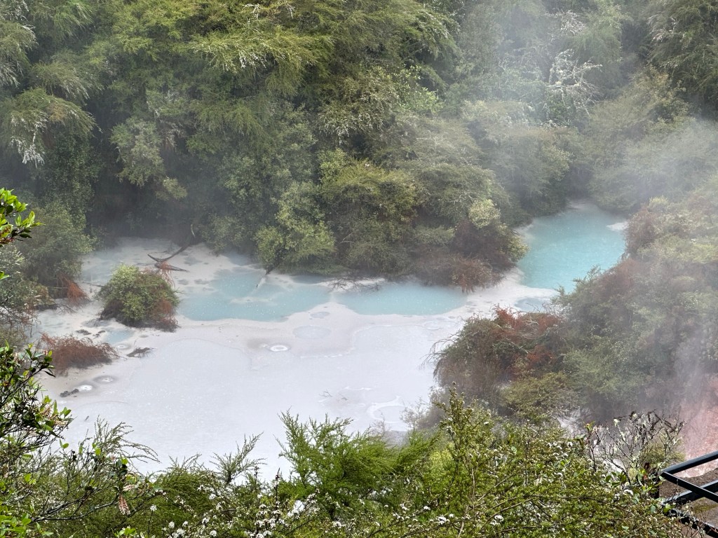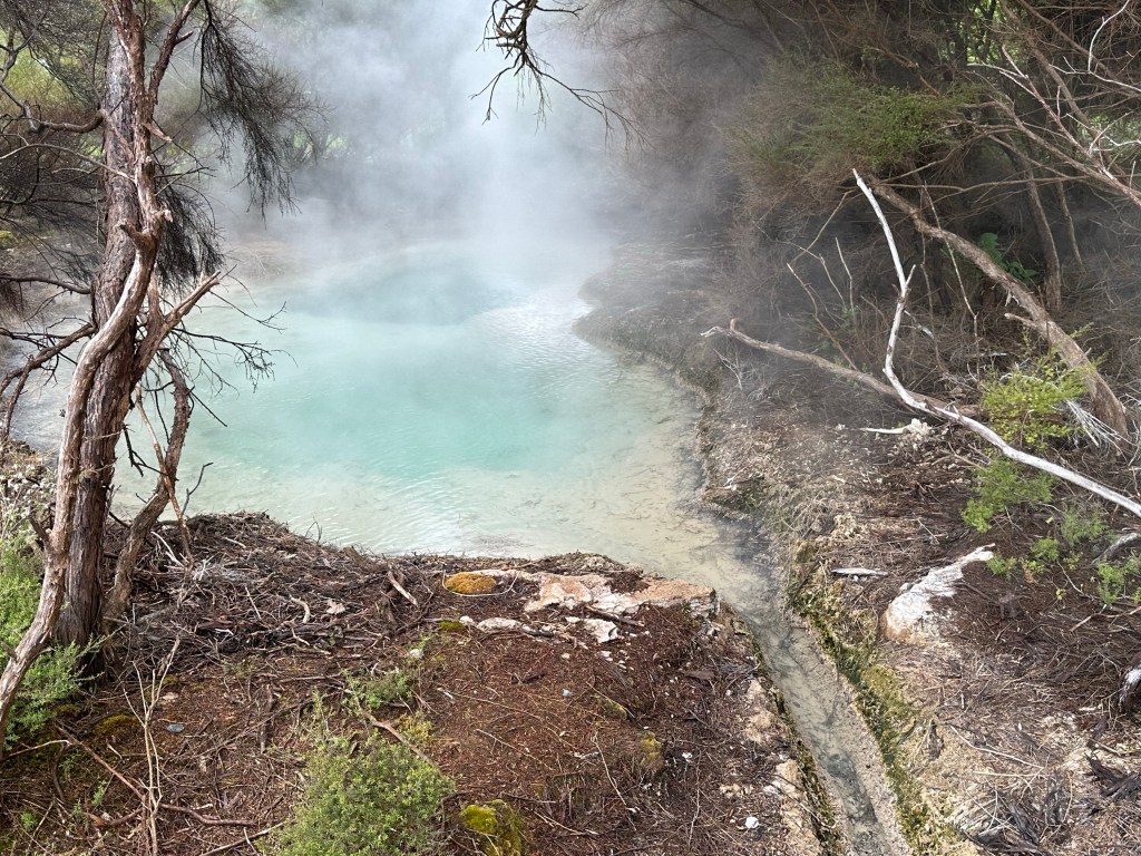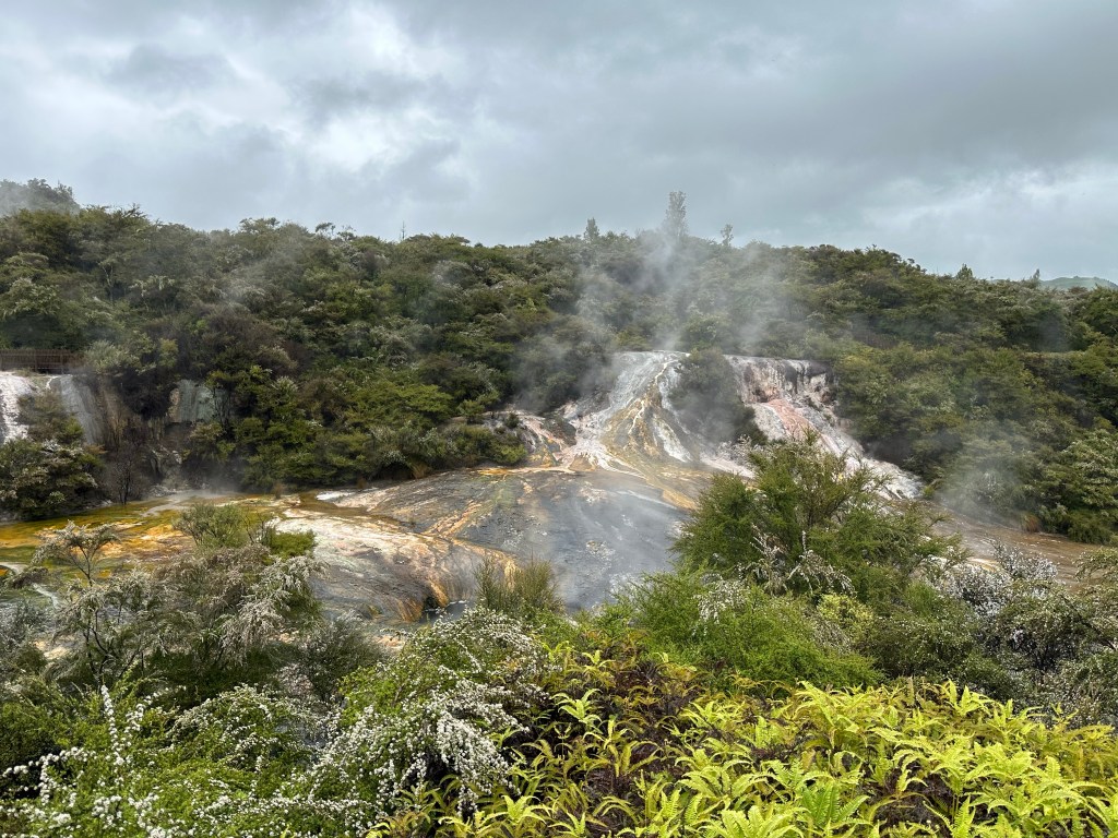 With the amount of movement I’ve been doing it’s not often that I’m not hungry right now so I was ready for Huka Prawn Park after Craters of the Moon. At Huka Prawn Park they farm prawns and have all sorts of little water activities on their manmade lakes (like paddle boats), but most importantly to me, they also have a restaurant that sits right along the river. Unfortunately, the returning rain meant that sitting out on the patio wasn’t practical but still, I could enjoy some prawns inside. I ordered a half kilo of prawns, garlic butter pita bread, and decided to splurge in a ginger fusion hard ginger beer. I poured my ginger beer over the delicate cup of ice and took a sip. Two things hit me at once; how damn delicious this is and the fizzing bubbles straight up my nose, tickling my nostrils. This may be one of the best things I have ever drank. Made by a local distillery I’m not sure I’ll be able to find it in the states and that makes me sad. The garlic pita was warm, toasty, and perfectly garlicky. My server brought over two buckets; an empty one for my shells and one with warm water to rinse my hands. And then the grand finale, a large plate of steaming prawns, staring at me, cooked in garlic butter, with two dipping sauces. The prawns had a different texture than I’m used to and I’m honestly not sure how I feel about them. Shelling them was also a lot of work and I hate getting all the butter and goop under my nails. But it was a great little meal. Right next to Huka Prawn Park is the Huka Jet Boat which does “extreme” jet boat rides up to Huka Falls. I seriously considered hopping on the next boat but after watching them along the river I decided to take a pass. I knew that the jet boats would mean getting soaking wet and it would get me out of there too late to get to Orakei Korako.