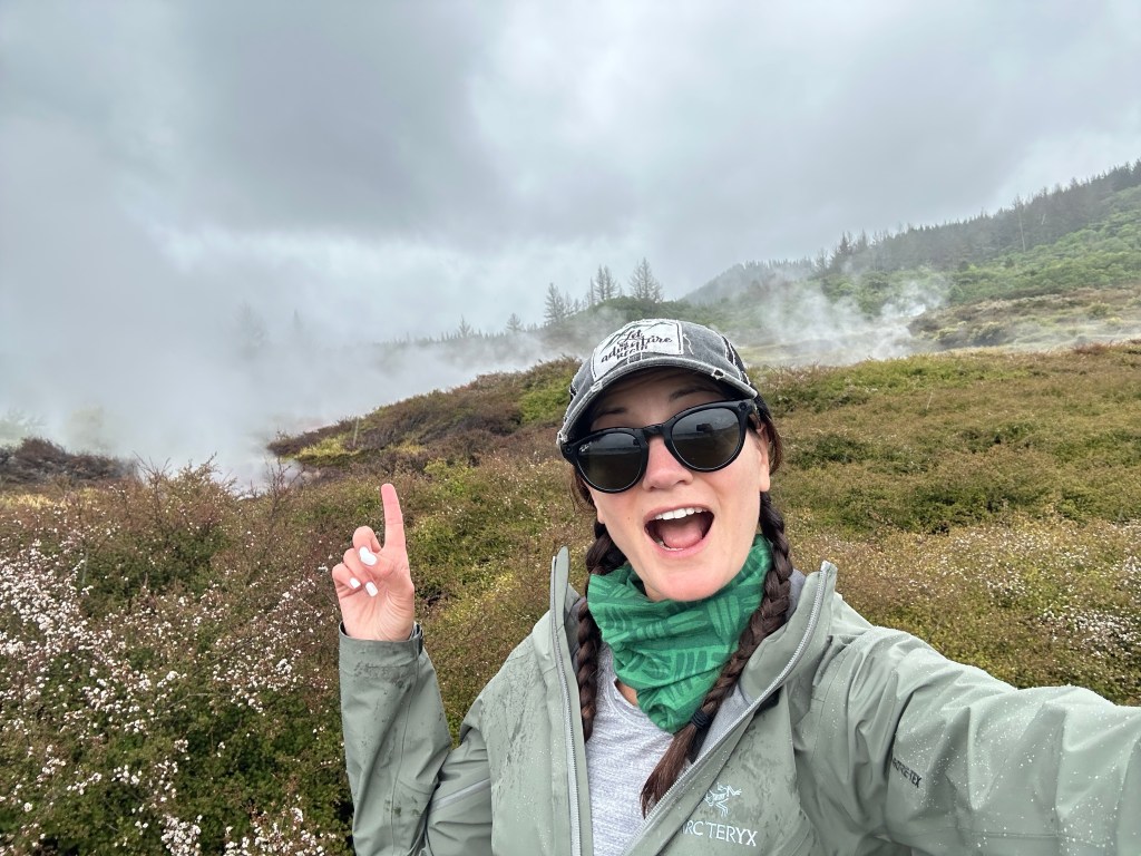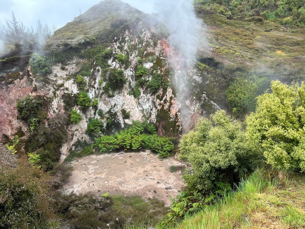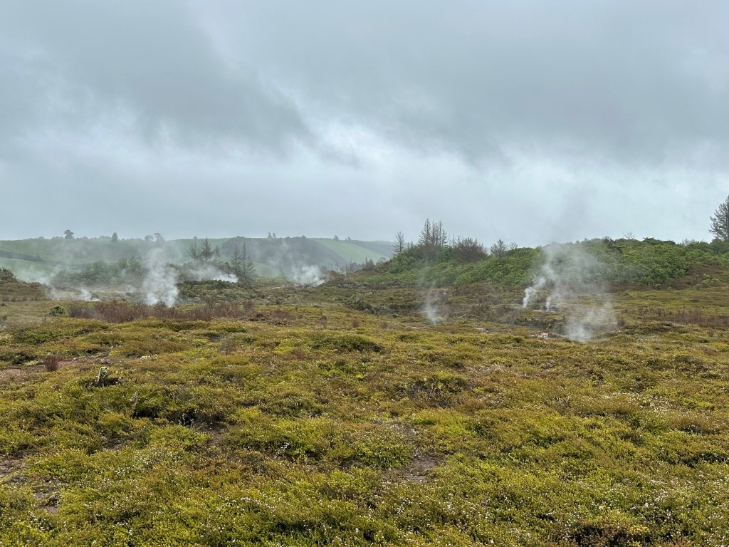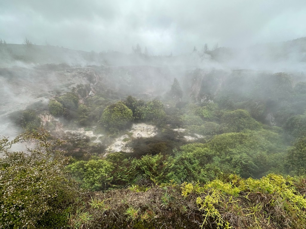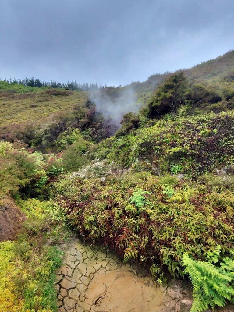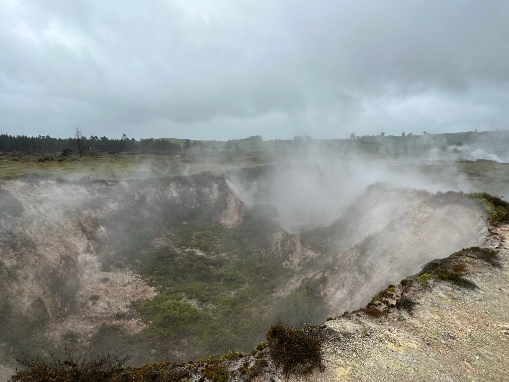 On a honey high, I figured why not hit up Craters of the Moon?! Craters of the Moon is a small valley full of bubbling craters and steam vents. It’s interesting because while it’s on geothermal land, it became more active in the 1950s due to the nearby power plant affecting underground water levels. The rain was cooperating enough, completely gone at times and drizzling annoyingly at others. While not the most interesting geothermal park it had some colorful and interesting craters with mud popping away. A side hike up the saddle between the Craters of the Moon valley and adjacent valley revealed a fascinating juxtaposition between the steaming geothermal land and the land of lush green bush with pastures beyond.