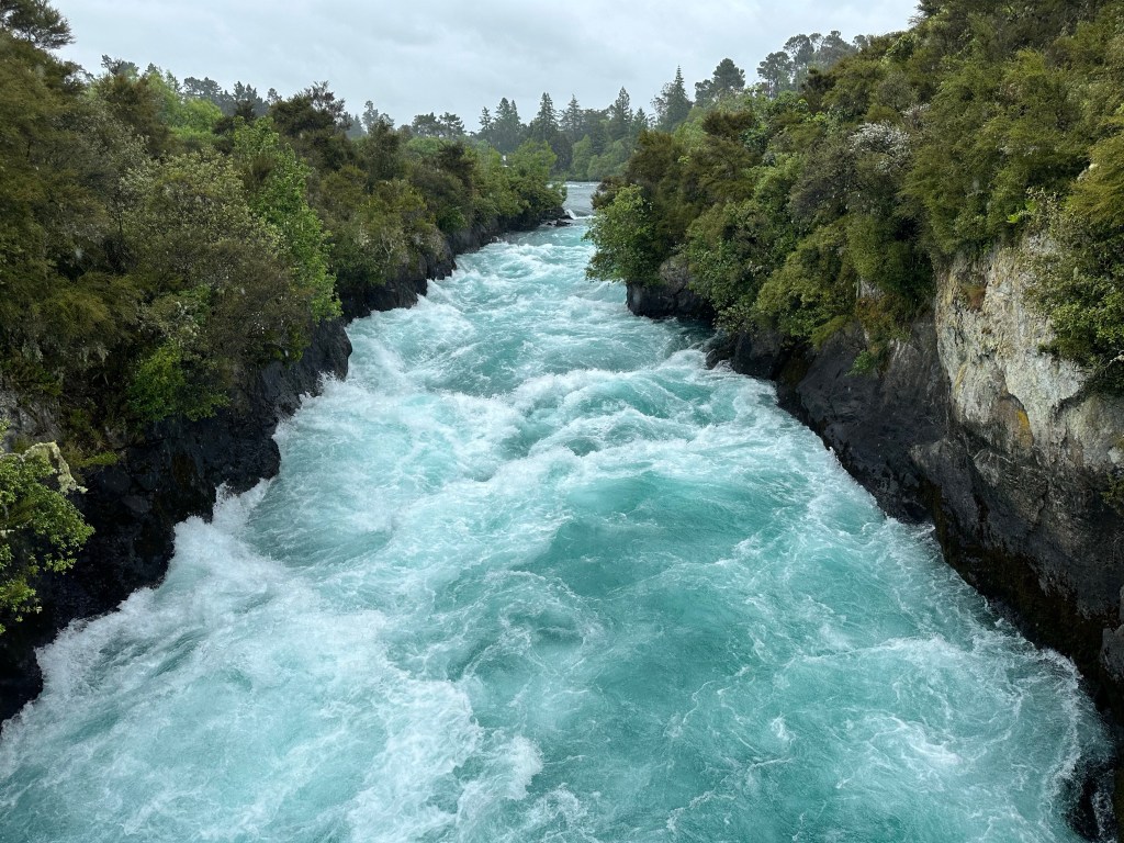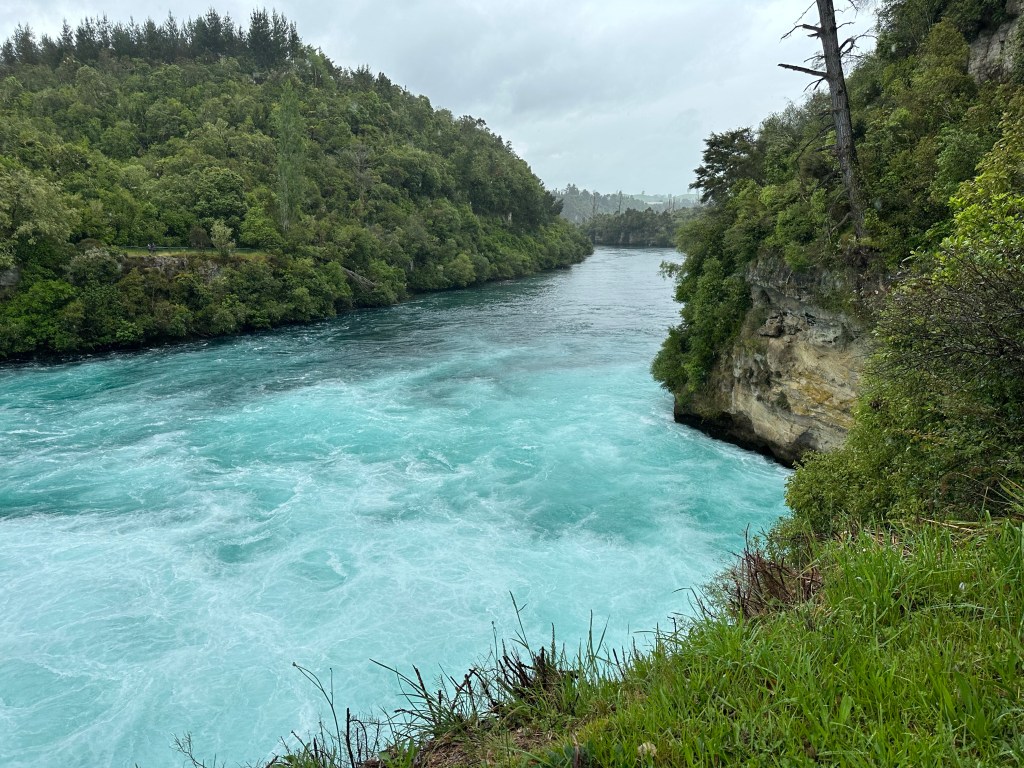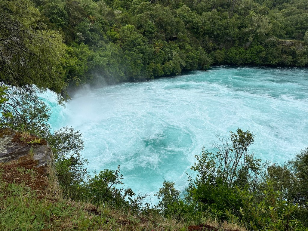 I’ve seen Huka Falls before (it’s where someone rolled down the falls in a barrel in Lord of the Rings – still haven’t seen that movie) but it was right there so I had it on my list for a quick visit today. Last time I actually did the hike along the river to the falls and discovered upon my arrival that there is actually a car park with access right there, right at them. So this time I just went to the car park because the rain was seriously not cooperating again. Huka Falls are impressive and stunning. These are falls that impress me. While not a long drop, the falls are more like a series of gorgeous rapids; aquamarine with foaming swirls that look like the egg swirling in egg drop soup. Enough water flows down the falls to fill five Olympic size swimming pools every minute.