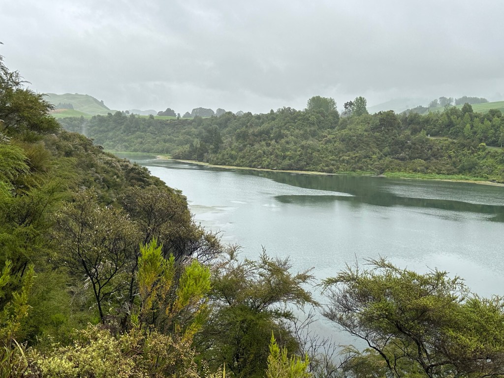 I drove along the edge of Tongariro National Park, waving goodbye to volcanoes. Remembering my rule to take all the scenic turnouts I did so on my way towards Turangi but with the cloudy rainy skies there wasn’t much to be seen.