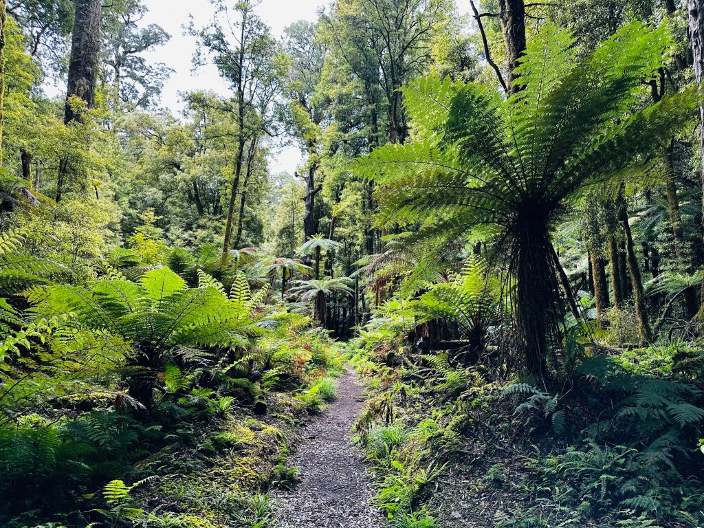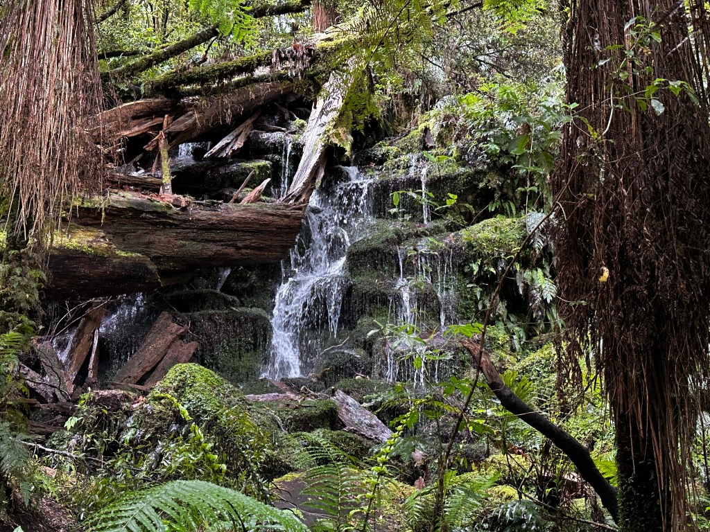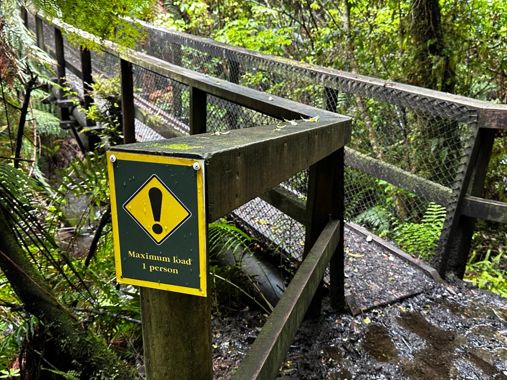 A large tree had fallen across the track and taken some smaller trees down with it. Slick with moss I climbed over them to continue on my path. The terrain changed a bit with more tall ferns and the river closer than it had been on the opposite side. One bridge had a sign warning that the maximum load is only one person; that’s always comforting. I feel like I prefer a little bit more leeway on weight than just one person!