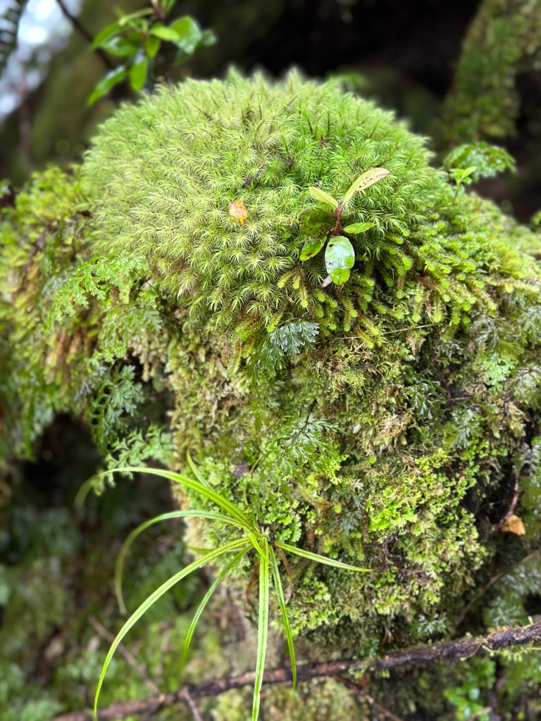 Waterfalls cascaded down the side of the forest walls along the edge of the trail and in places they had to be dodged or their base streams carefully crossed. Boulders, trees, everything was covered in moss. At times the track narrowed to less than two feet wide with sheer drops off the side to the river below. No pictures can do this justice, it was like walking through a mossy green fairly tale wonderland. Have I mentioned that I’m sooooo happy not to be wearing rain gear right now?