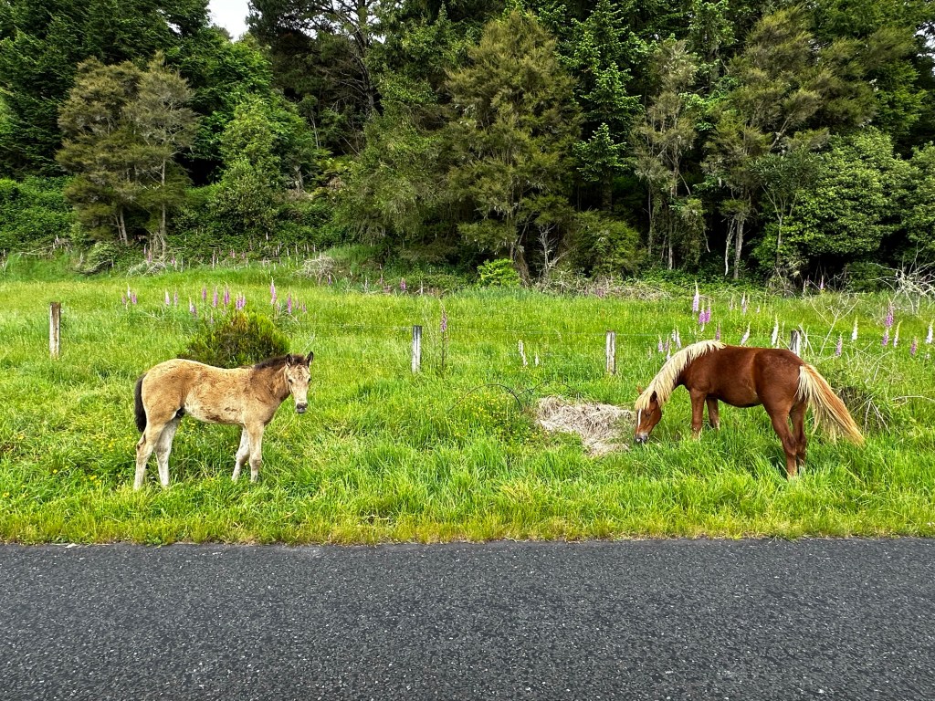 A sign on the side of the road warned of “wandering stock” and, sure enough, I encountered a small herd of horses lazing on the side of the road. With babies! I couldn’t help but let out a little squeal. I want a horse.