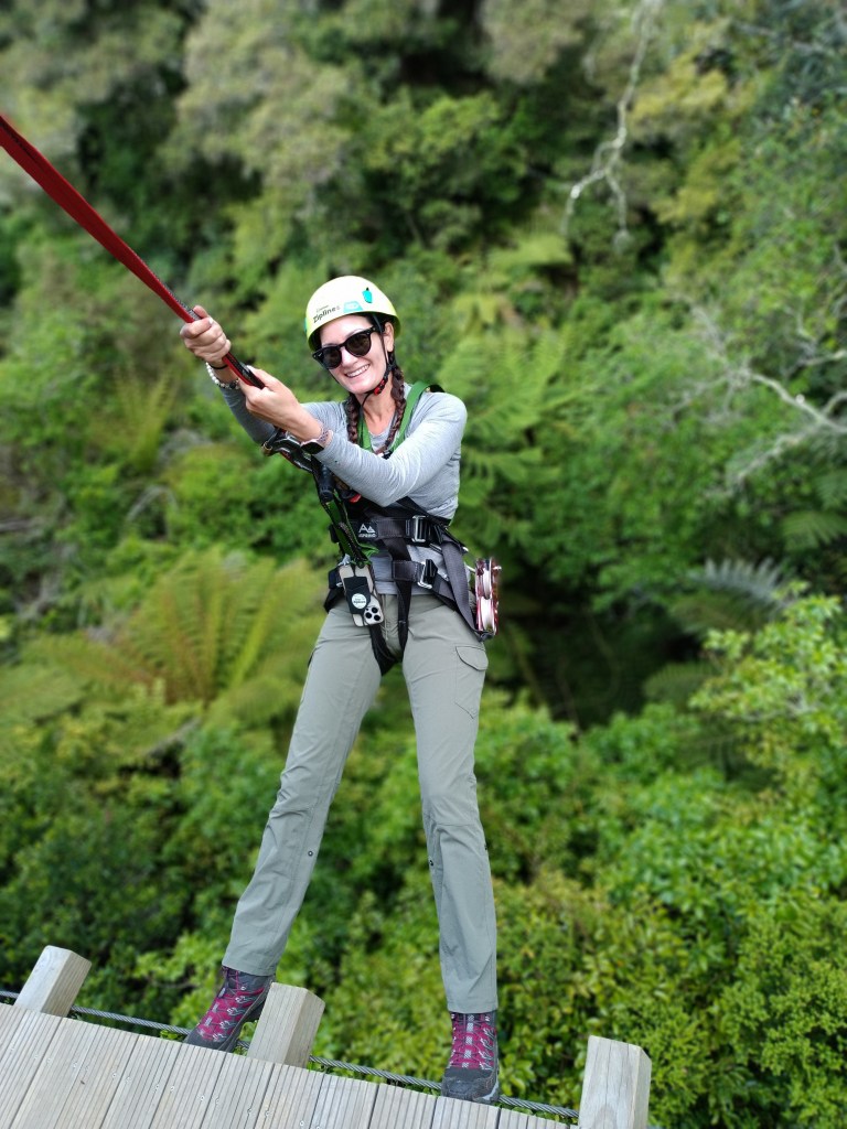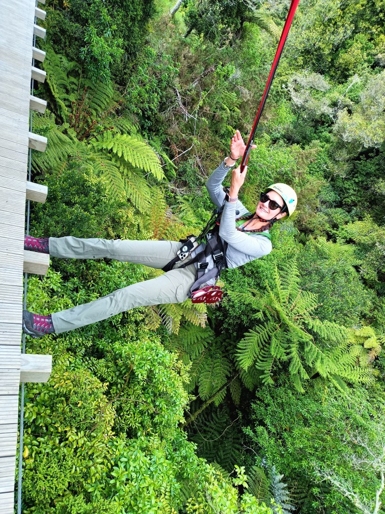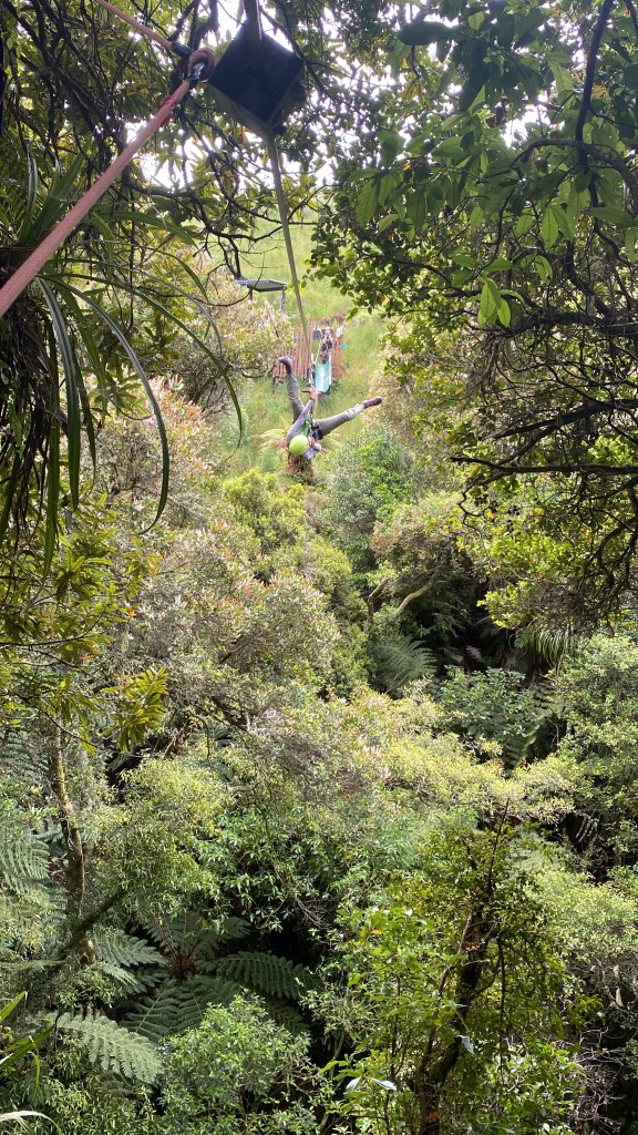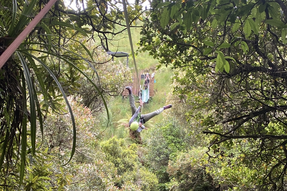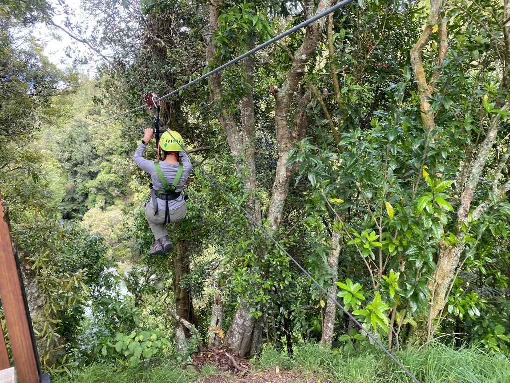 In true Kiwi form, even during a zip line adventure there is a break for a cup of tea. Nui and Sam led us to a small seating area and handed us each a cup of fresh kawa kawa tree as they shared how their company has been restoring the forest to the once cleared land that we had now found ourselves in. Looking around, I could see the young trees freshly planted on the hillside. They are proud to be at capacity for the current number of trees to be forested. Previously, they used to give adventure goers the opportunity to plant a tree but so many had been planted in the available land that it is no longer part of the day. Instead, we were each given a tree tag that they would save and when additional trees were planted higher up the hill they would attach. The following line was a tandem race line. Since I was the only person solo in the group I got to race Sam and, of course, he let me win.
