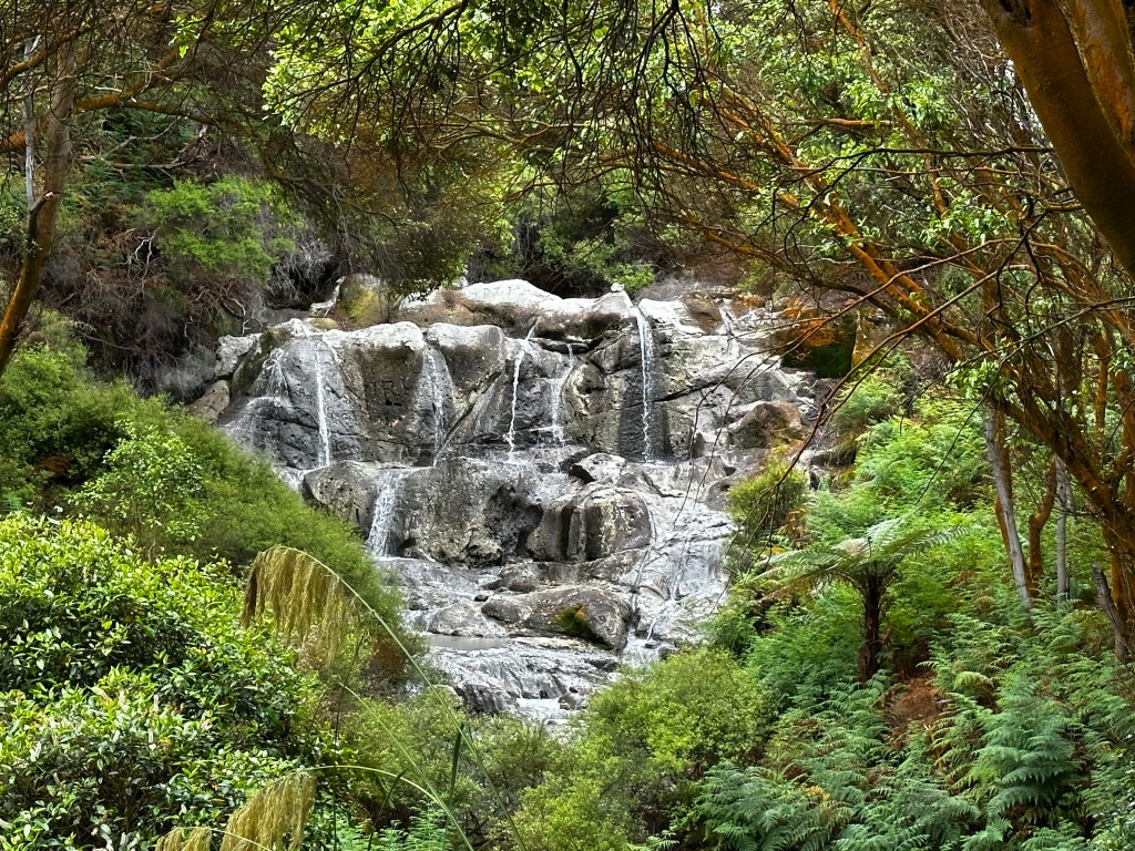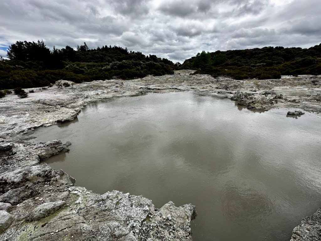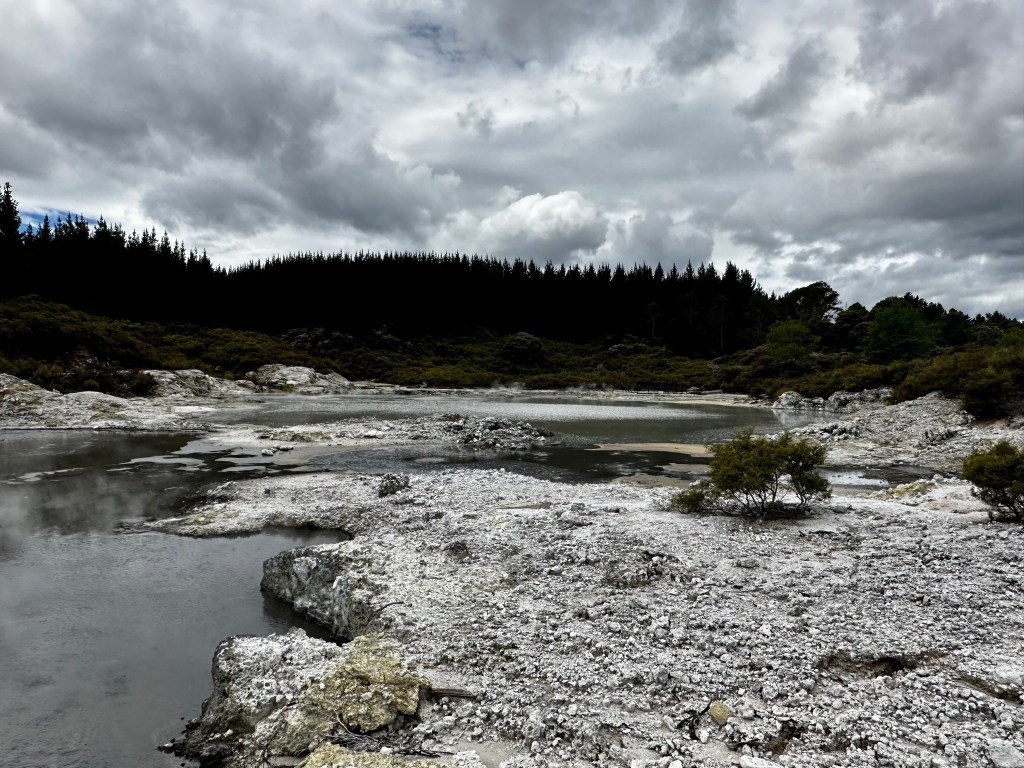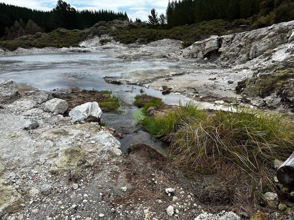 It’s also crazy that these geothermal areas just appear in the middle of the bush. Standing in one spot and turning full circle the entire geothermal area is surrounded by trees and greenery, somehow just in this little valley the earth’s anger and power surge through. Between arid sulphur belching pits and land there is even a narrow patch of bush with a lovely hot water falls. Such a trip.