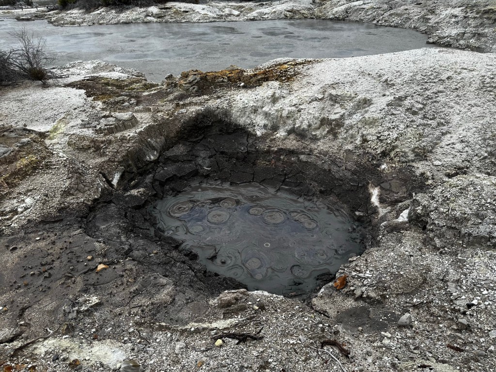 I stood in one spot just listening to the sounds around me. On one side of the path was quickly hissing sizzles, like water being sprinkled into a hot frying pan, on the other side the deep gurgle of boiling mud bouncing and spraying.