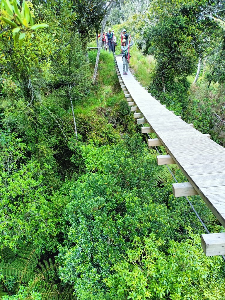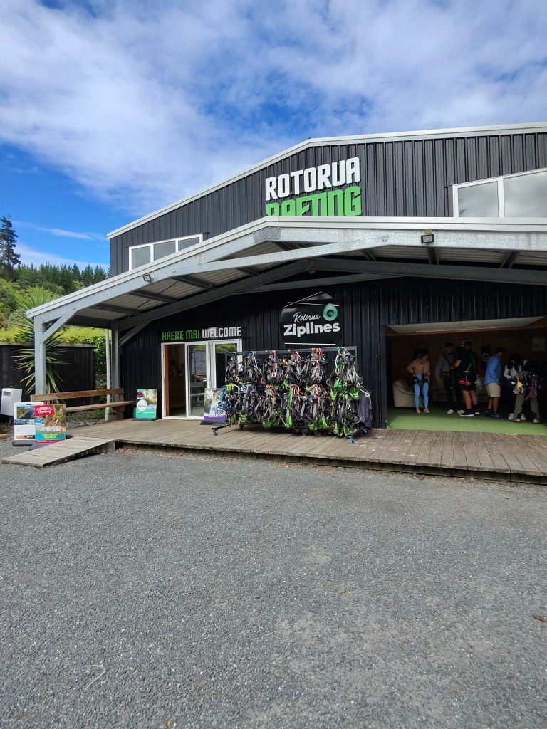 I arrived right on time at the adventure center in Okere to a group of cheery Kiwi and Māori guides and other guests. The guides offered to lend phone straps to anyone who wanted to secure their phone for the excursion and I appreciated that nice touch. Myself and the other six zippers were strapped into harnesses, fit with helmets, and loaded into a van for a whopping one minute drive to the start of our adventure. I had anxiety leaving my purse with ID and car keys behind at the main office but if there’s one place it’s safe to do so I feel like this is it. Guide Nui pointed out steps down to view the river, encouraging anyone who wanted to see it raging to head down the steps because we’d only see it from the air the rest of the time. Of course I took the steep steps down to, well, almost to, a viewing platform. I had to stop a couple steps short of the platform as it was completely flooded with the river absolutely raging across. Yah, I’m definitely not sad that my rafting was cancelled.