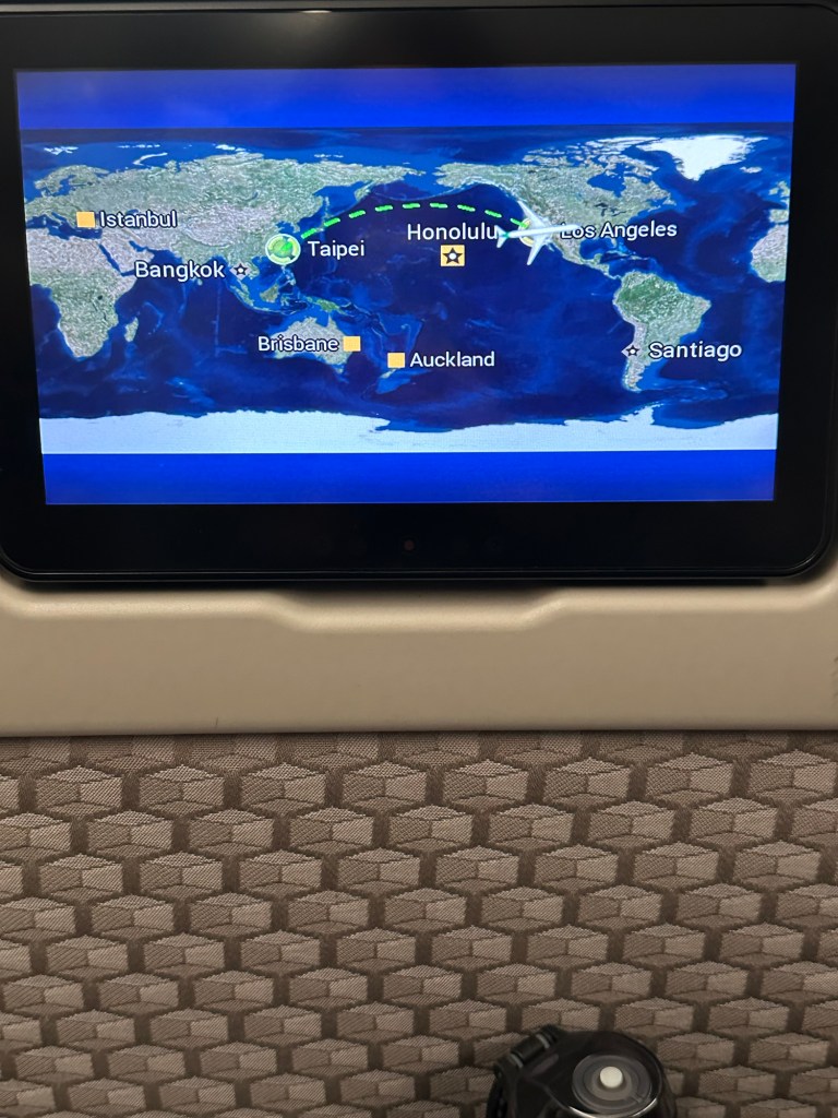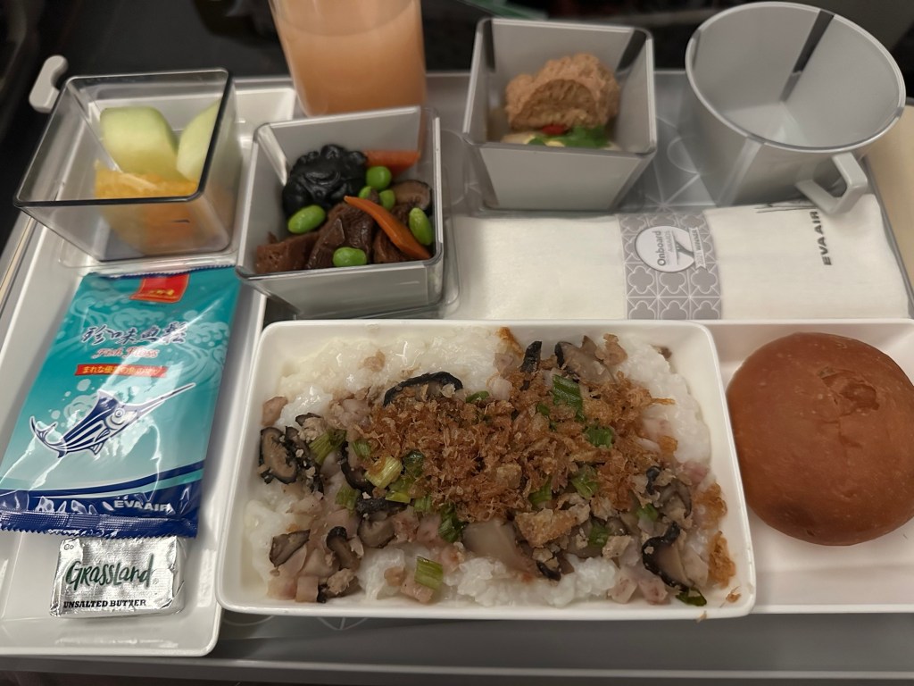 I flew EVA Air from LAX to TPE. The last time I flew them in 2019 they were the Hello Kitty airline and everything, from the plane exterior to the boarding passes to the amenity kits on board, where Hello Kitty branded. Those days are now gone and they are pretty boring but the food was delicious. Except for the “fish floss” that came with my congee selection for breakfast; I tried but it was too much like eating fish food (its not far off, its dried swordfish, sugar, and oil). I flew Premium Economy and was lucky with a child who slept the majority of the flight next to me. At first I was terrified that I wouldn’t get any sleep because I am so uncomfortable trying to sleep on a plane without a lay flat but thanks to two sleeping pills and the most comfortable travel pillow ever that I picked up on my Antarctica trip a few months ago I managed to sleep about seven hours! Deep enough that I was even dreaming!