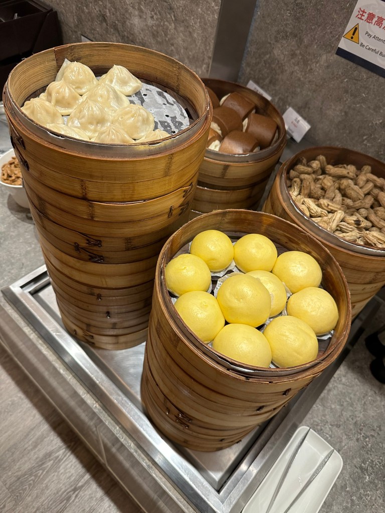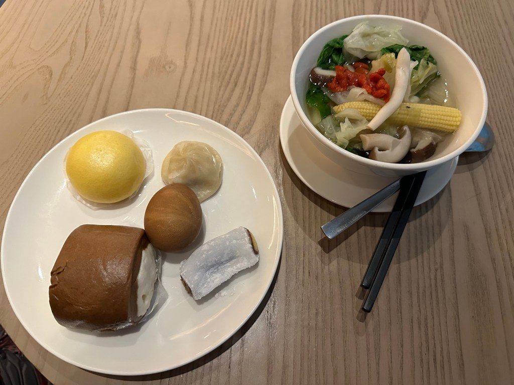 The flight got into Taipei a little early and I was spoiled. My departing gate for my next flight was the gate next door and the lounge was only a couple hundred yards away. Landing at 4:45am I was lucky that the closest lounge opened at 5am and I was there at 5 on the dot to spend an hour before my 6am boarding time to KUL. Though I had eaten a full and delicious meal on the plane the sights and smells of the food in the lounge excited me; I forgot how much I love southeast Asian cuisine!!! I ordered a bowl of vegetable noodle soup from the live action station and accompanied that with a tea egg, a mochi bean roll, and some other dim sum that I’m not quite sure what they were but they were delicious.