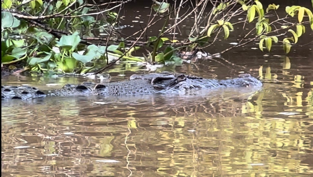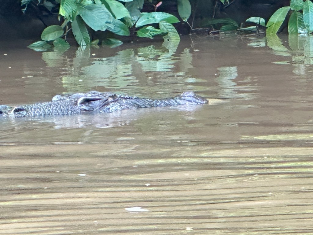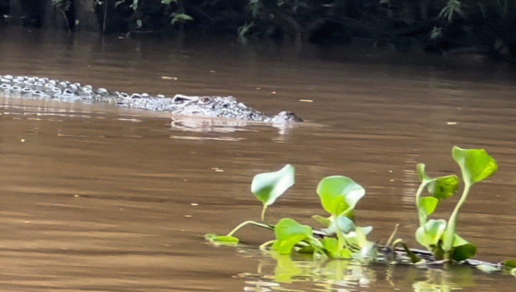A couple hundred more yards it was revealed; a crocodile! This one was much closer and also seemed much smaller than the one whose head was spotted yesterday. Our guide, Kurt, estimated her at 2.5-3 meters long and I must admit, I was a little disappointed it wasn’t larger. Watching her swim lazily alongside the boats, patrolling the river was powerful; there’s no way you can tell me that a crocodile isn’t a dinosaur. Kurt informed us that her (I’m calling it a her because of its petite stature) comfort being alongside the boats without showing signs of stress or moving away was disturbing because it means she’s becoming too habituated to them and likely she’s studying us; to learn how someday the boats could become prey. That was disturbing. I remembered my binoculars this morning but looking at her through them was way too close for comfort. We floated alongside her for a while before finally moving on to let her be in peace.